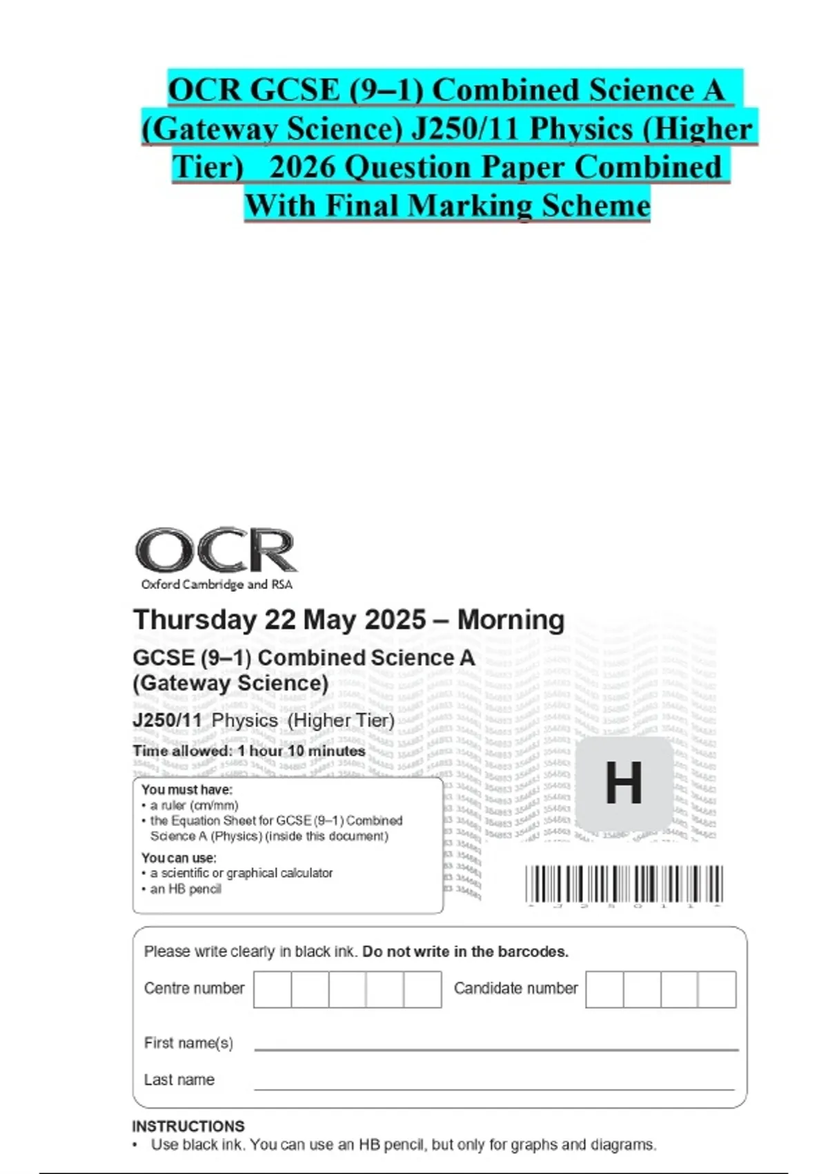 OCR GCSE (9–1) Combined Science A (Gateway Science) J250/11 Physics (Higher Tier) 2026 Question Paper Combined With Final Marking Scheme