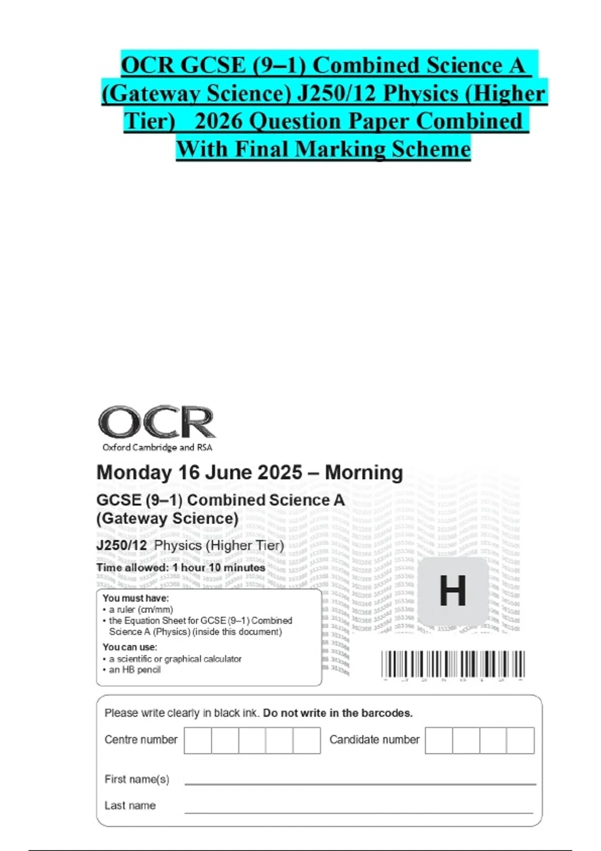 OCR GCSE (9–1) Combined Science A (Gateway Science) J250/12 Physics (Higher Tier) 2026 Question Paper Combined With Final Marking Scheme