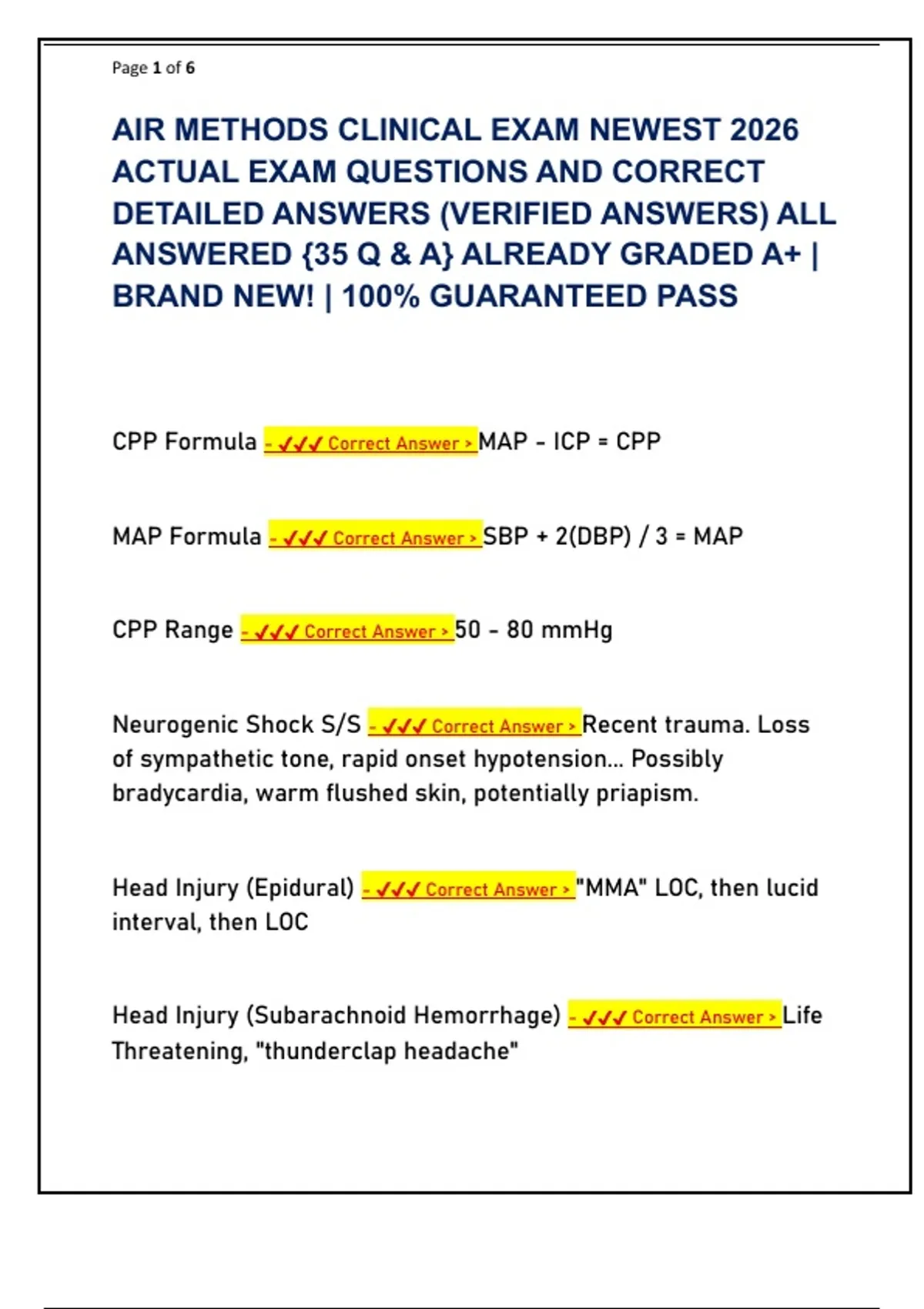 Head Injury (Subarachnoid Hemorrhage) - ✔✔✔ Correct Answer > Life
