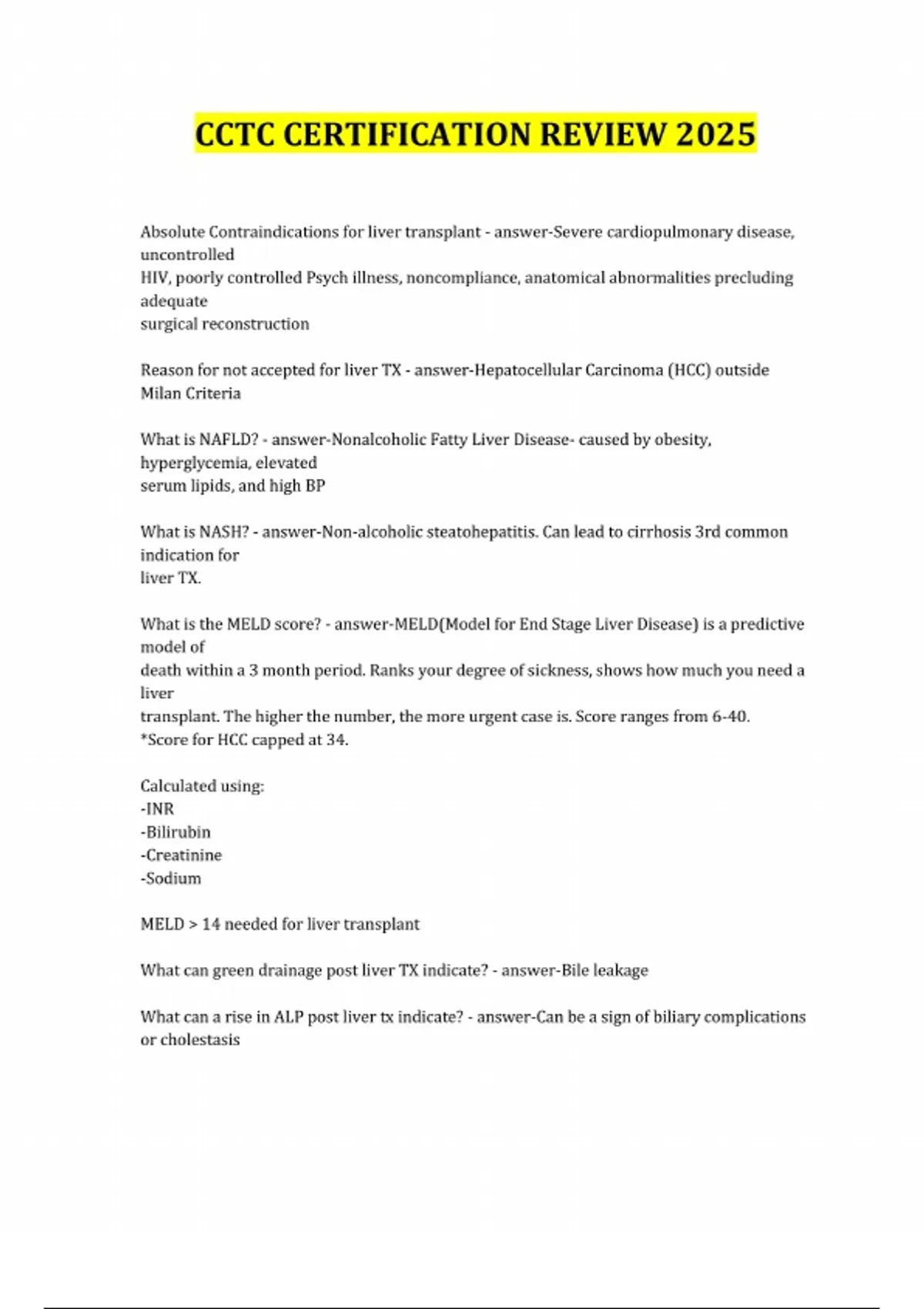 CCTC CERTIFICATION REVIEW 2025 Absolute Contraindications for liver transplant - answer-Severe cardiopulmonary disease, uncontrolled HIV, poorly controlled Psych illness, noncompliance, anatomical abnormalities precluding adequate surgical reconstruction Reason for not accepted for liver TX - answer-Hepatocellular Carcinoma (HCC) outside Milan Criteria What is NAFLD? - answer-Nonalcoholic Fatty Liver Disease- caused by obesity, hyperglycemia, elevated serum lipids, and high BP What is NASH? - answer-Non-alcoholic steatohepatitis. Can lead to cirrhosis 3rd common indication for liver TX. What is the MELD score? - answer-MELD(Model for End Stage Liver Disease) is a predictive model of death within a 3 month period. Ranks your degree of sickness, shows how much you need a liver transplant. The higher the number, the more urgent case is. Score ranges from 6-40. *Score for HCC capped at 34. Calculated using: -INR -Bilirubin -Creatinine -Sodium MELD > 14 needed for liver transplant What can green drainage post liver TX indicate? - answer-Bile leakage What can a rise in ALP post liver tx indicate? - answer-Can be a sign of biliary complications or cholestasis
