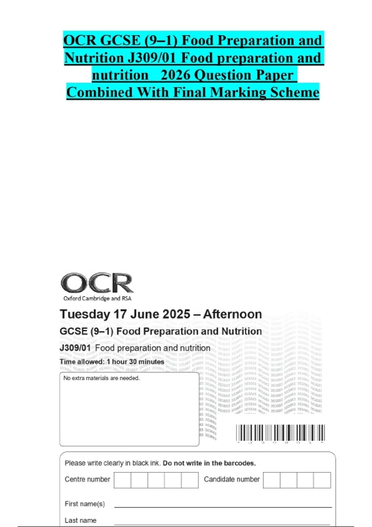 OCR GCSE (9–1) Food Preparation and Nutrition J309/01 Food preparation and nutrition 2026 Question Paper Combined With Final Marking Scheme