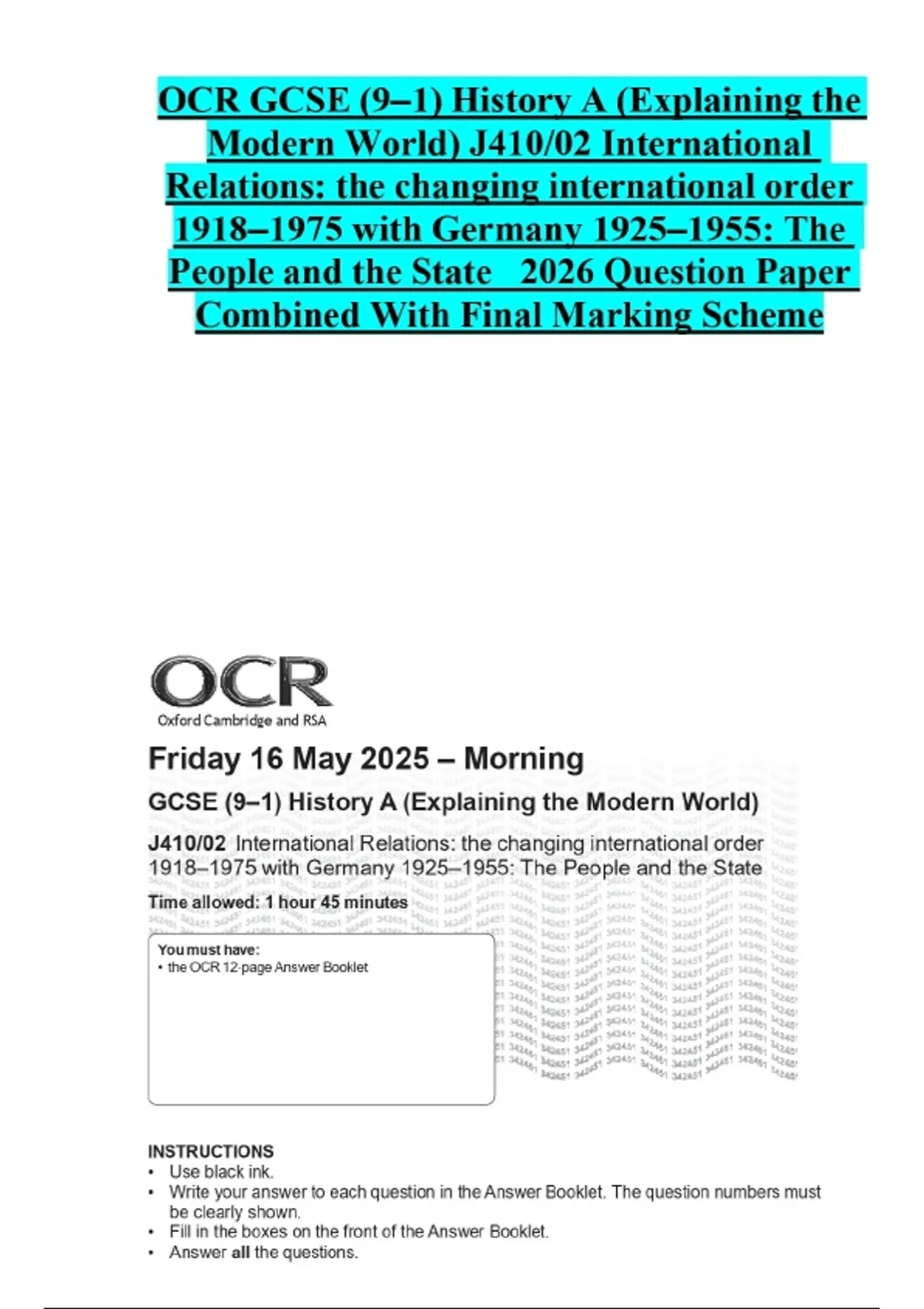 OCR GCSE (9–1) History A (Explaining the Modern World) J410/02 International Relations: the changing international order 1918–1975 with Germany 1925–1955: The People and the State 2026 Question Paper Combined With Final Marking Scheme