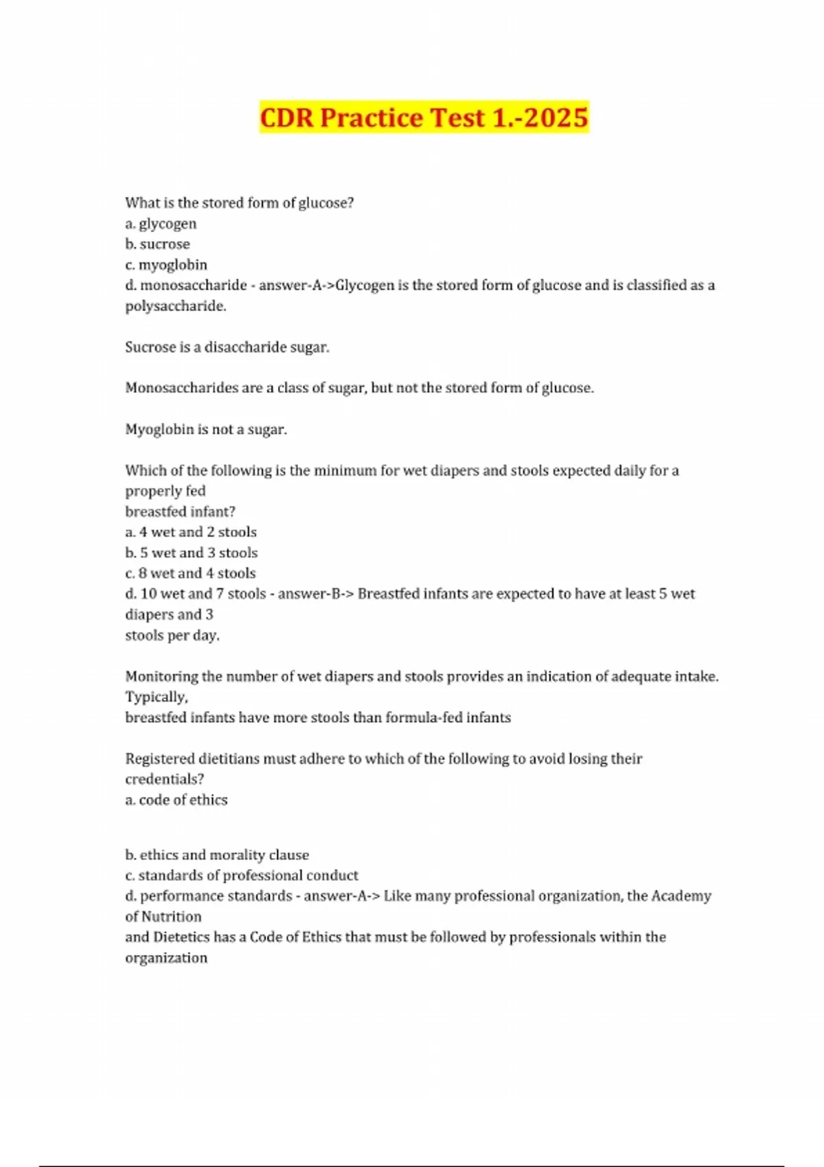 CDR Practice Test 1.-2025 What is the stored form of glucose? a. glycogen b. sucrose c. myoglobin d. monosaccharide - answer-A->Glycogen is the stored form of glucose and is classified as a polysaccharide. Sucrose is a disaccharide sugar. Monosaccharides are a class of sugar, but not the stored form of glucose. Myoglobin is not a sugar. Which of the following is the minimum for wet diapers and stools expected daily for a properly fed breastfed infant? a. 4 wet and 2 stools b. 5 wet and 3 stools c. 8 wet and 4 stools d. 10 wet and 7 stools - answer-B-> Breastfed infants are expected to have at least 5 wet diapers and 3 stools per day. Monitoring the number of wet diapers and stools provides an indication of adequate intake. Typically, breastfed infants have more stools than formula-fed infants Registered dietitians must adhere to which of the following to avoid losing their credentials? a. code of ethics b. ethics and morality clause c. standards of professional conduct d. performance standards - answer-A-> Like many professional organization, the Academy of Nutrition and Dietetics has a Code of Ethics that must be followed by professionals within the organization