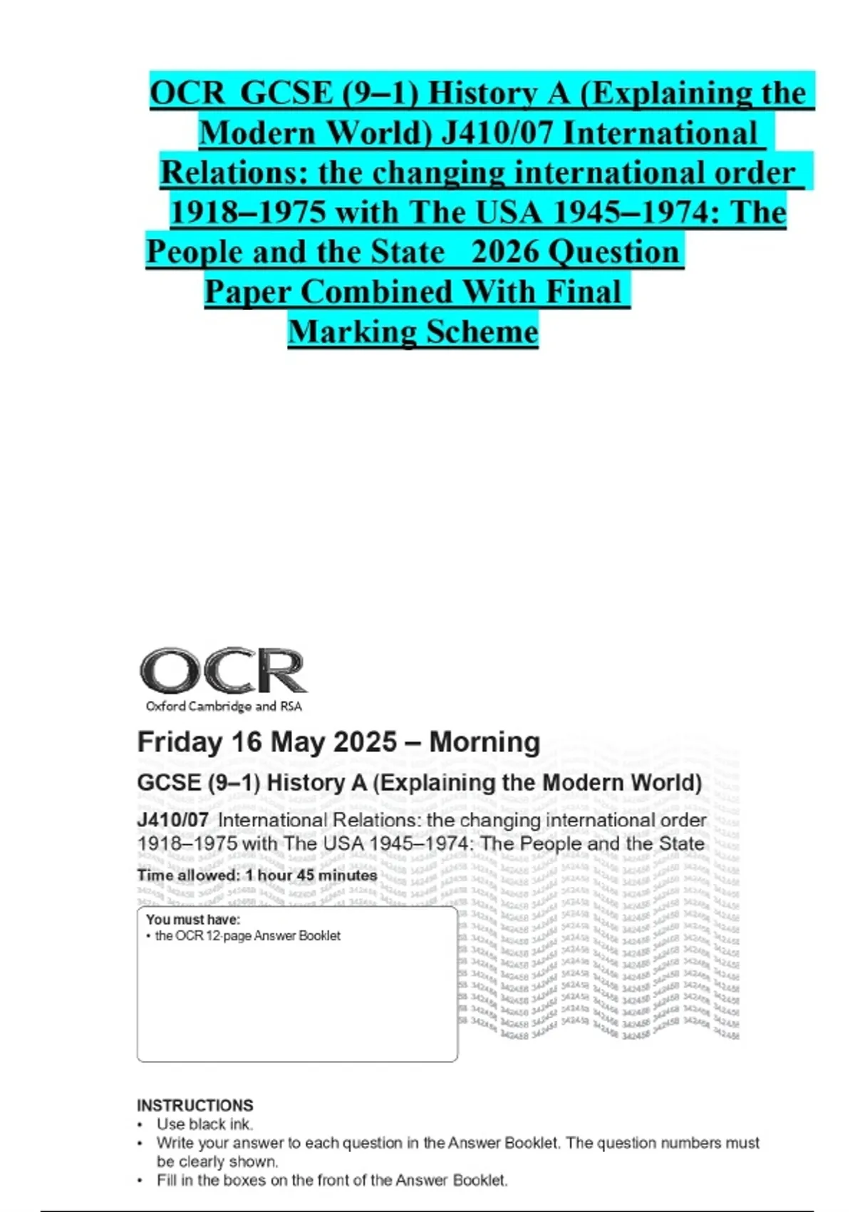 OCR GCSE (9–1) History A (Explaining the Modern World) J410/07 International Relations: the changing international order 1918–1975 with The USA 1945–1974: The People and the State 2026 Question Paper Combined With Final Marking Scheme