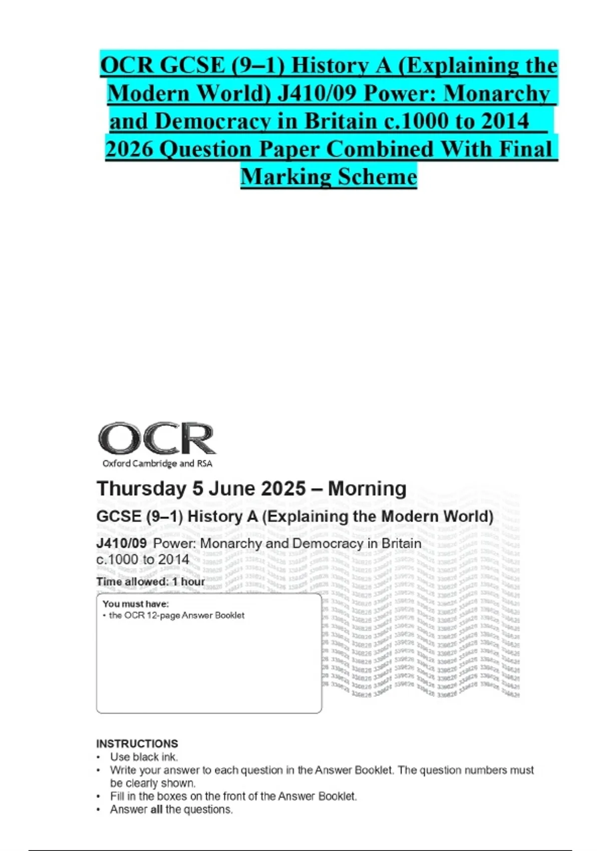 OCR GCSE (9–1) History A (Explaining the Modern World) J410/09 Power: Monarchy and Democracy in Britain c.1000 to 2014 2026 Question Paper Combined With Final Marking Scheme