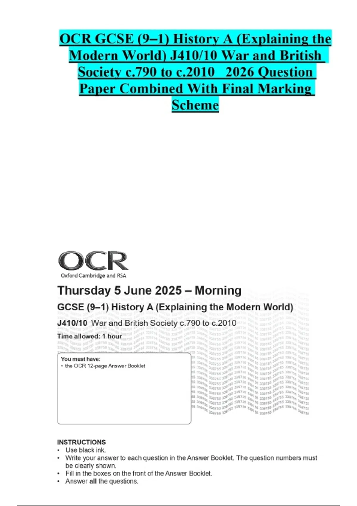 OCR GCSE (9–1) History A (Explaining the Modern World) J410/10 War and British Society c.790 to c. Question Paper Combined With Final Marking Scheme