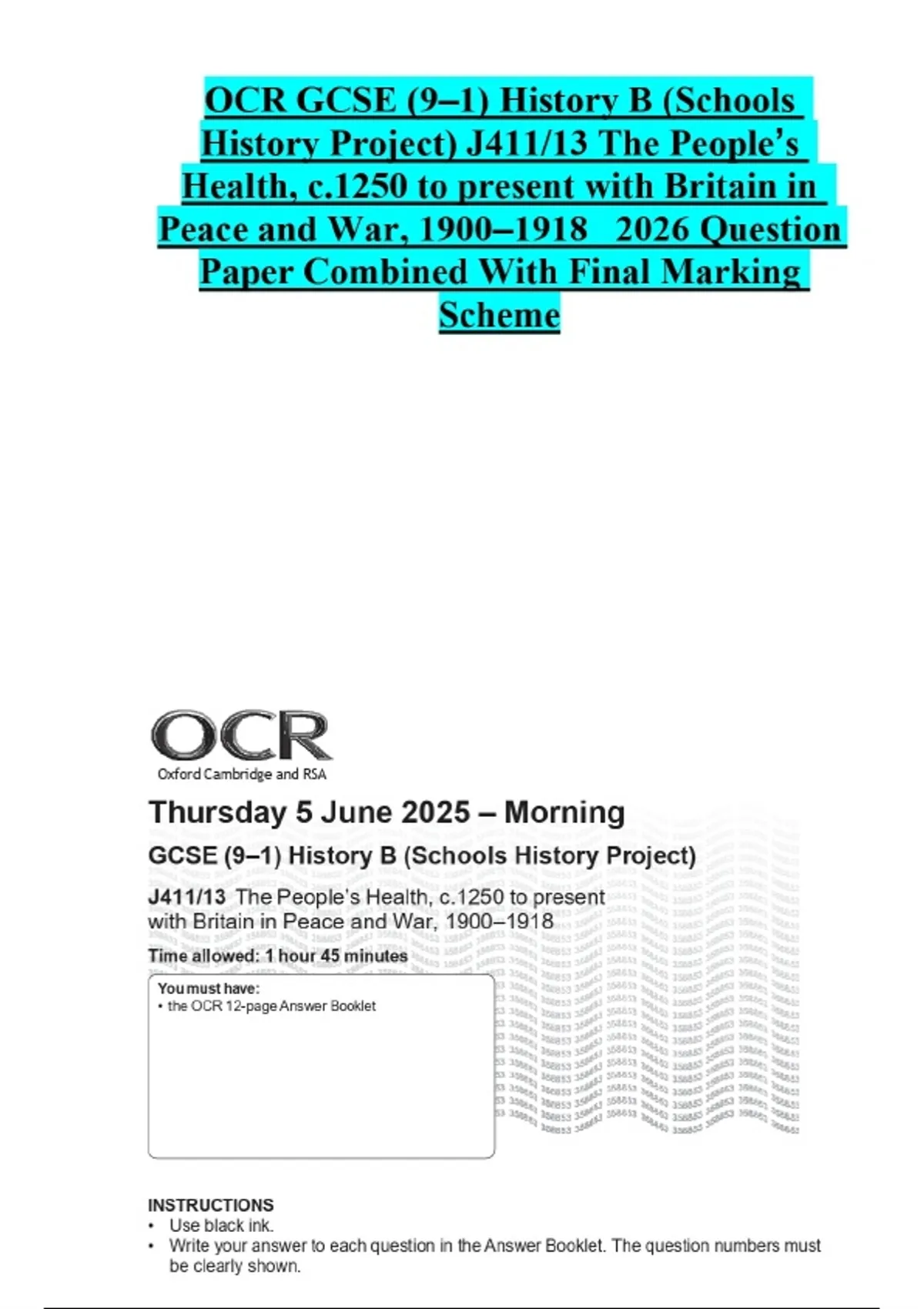 OCR GCSE (9–1) History B (Schools History Project) J411/13 The People’s Health, c.1250 to present with Britain in Peace and War, 1900– Question Paper Combined With Final Marking Scheme