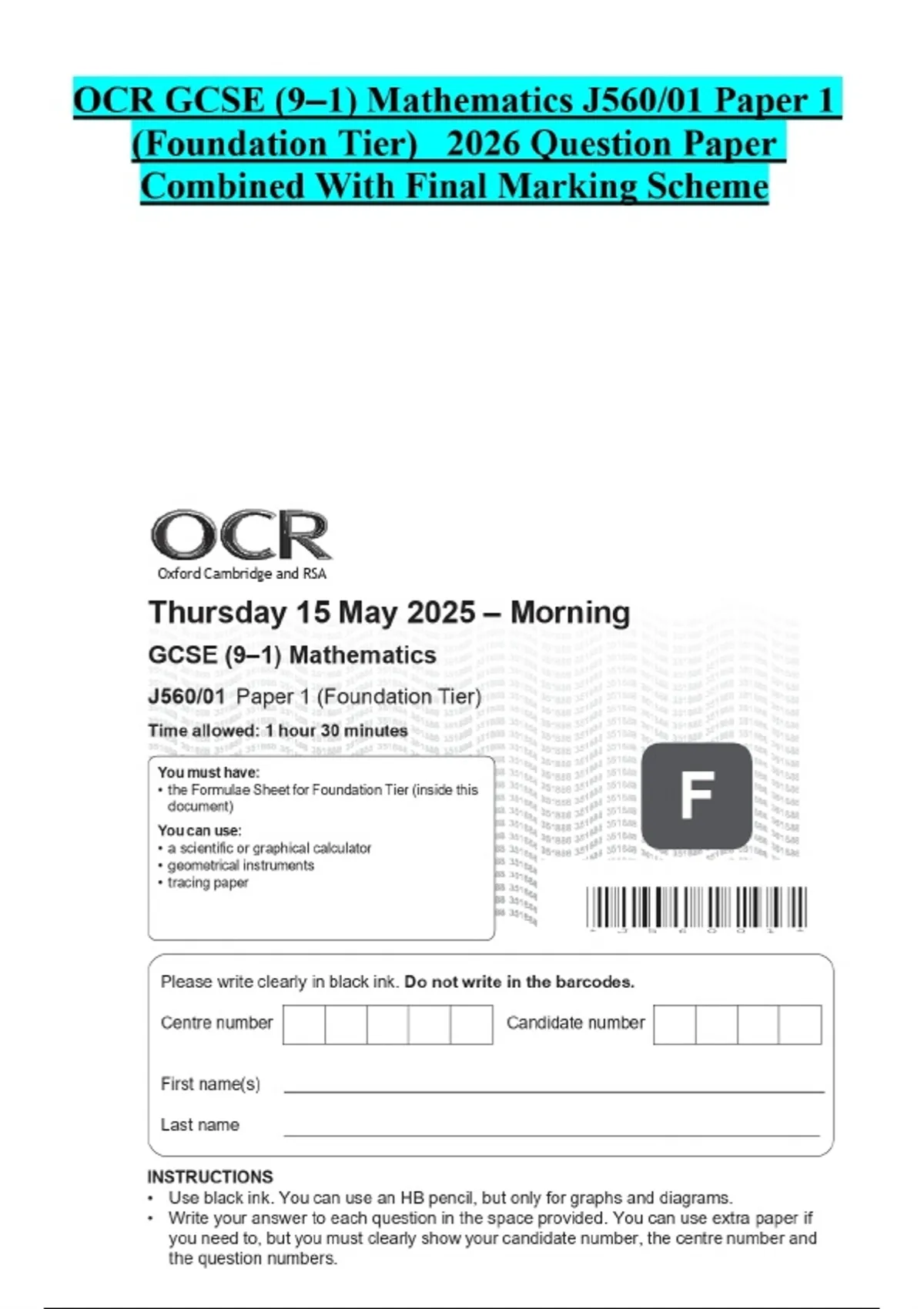 OCR GCSE (9–1) Mathematics J560/01 Paper 1 (Foundation Tier) 2026 Question Paper Combined With Final Marking Scheme