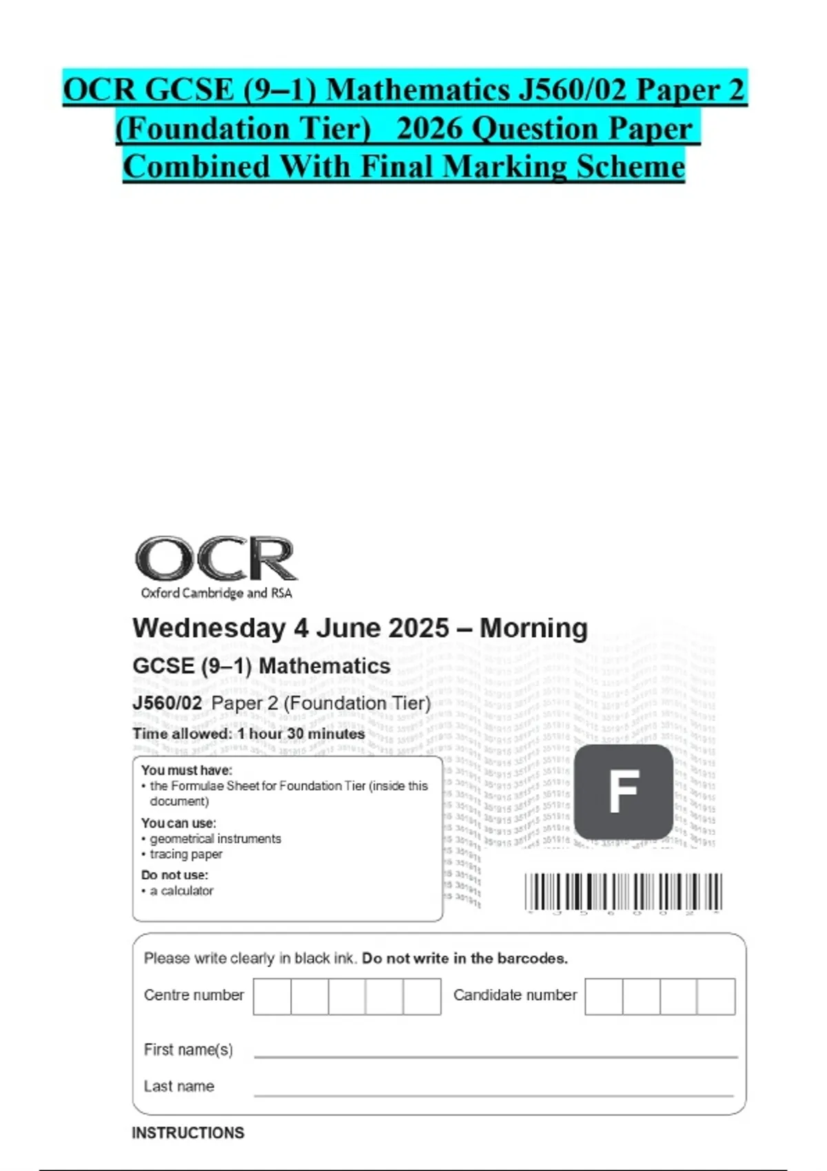 OCR GCSE (9–1) Mathematics J560/02 Paper 2 (Foundation Tier) 2026 Question Paper Combined With Final Marking Scheme