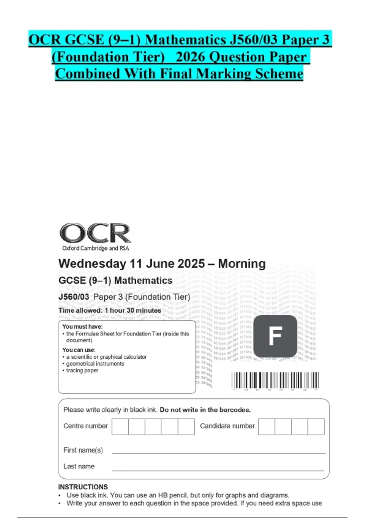 OCR GCSE (9–1) Mathematics J560/03 Paper 3 (Foundation Tier) 2026 Question Paper Combined With Final Marking Scheme