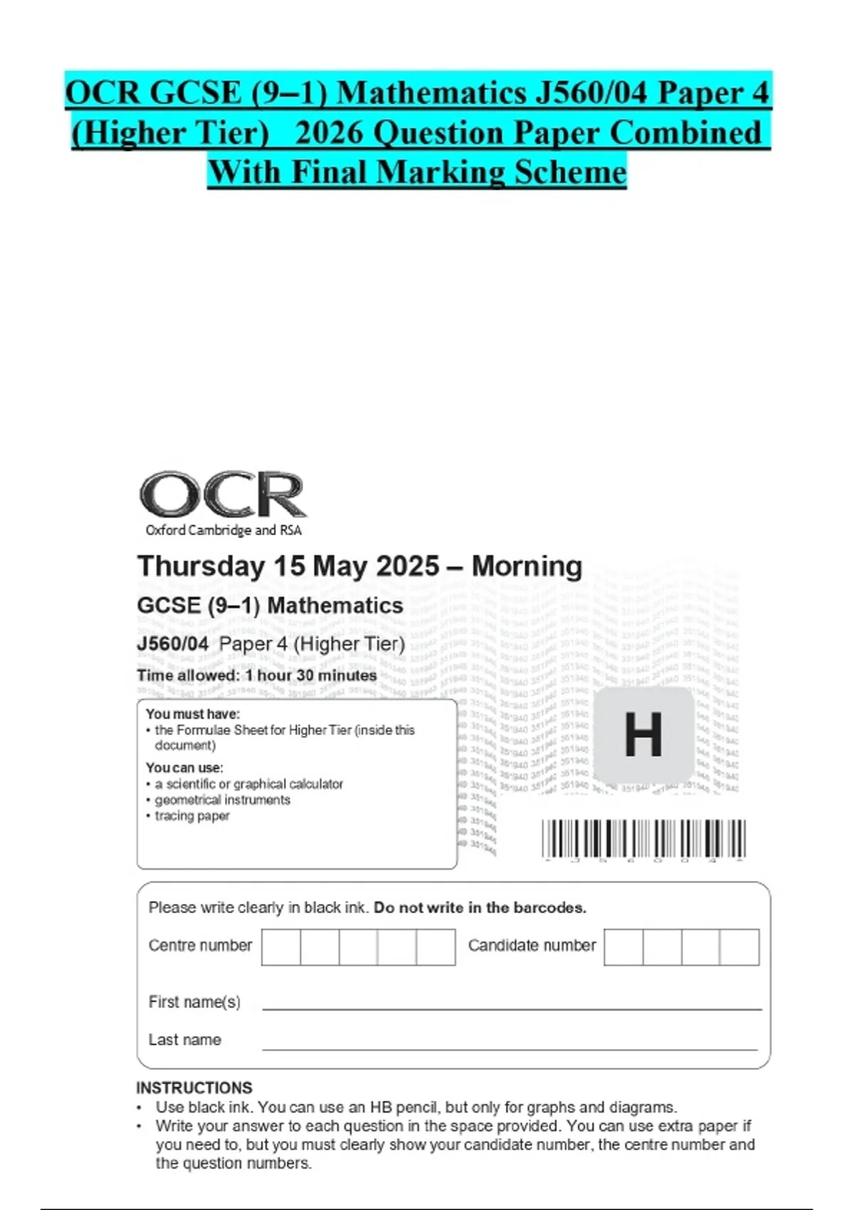 OCR GCSE (9–1) Mathematics J560/04 Paper 4 (Higher Tier) 2026 Question Paper Combined With Final Marking Scheme