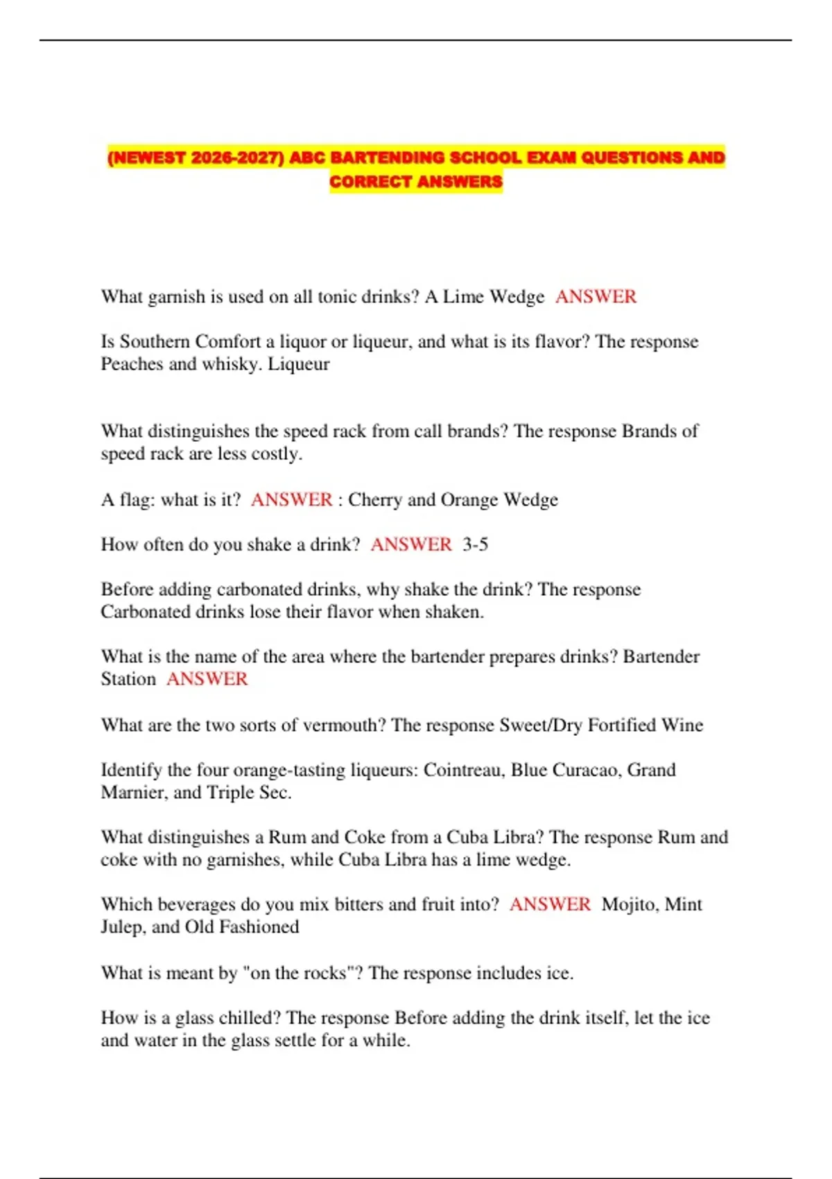 (NEWEST 2026-2027) ABC BARTENDING SCHOOL EXAM QUESTIONS AND