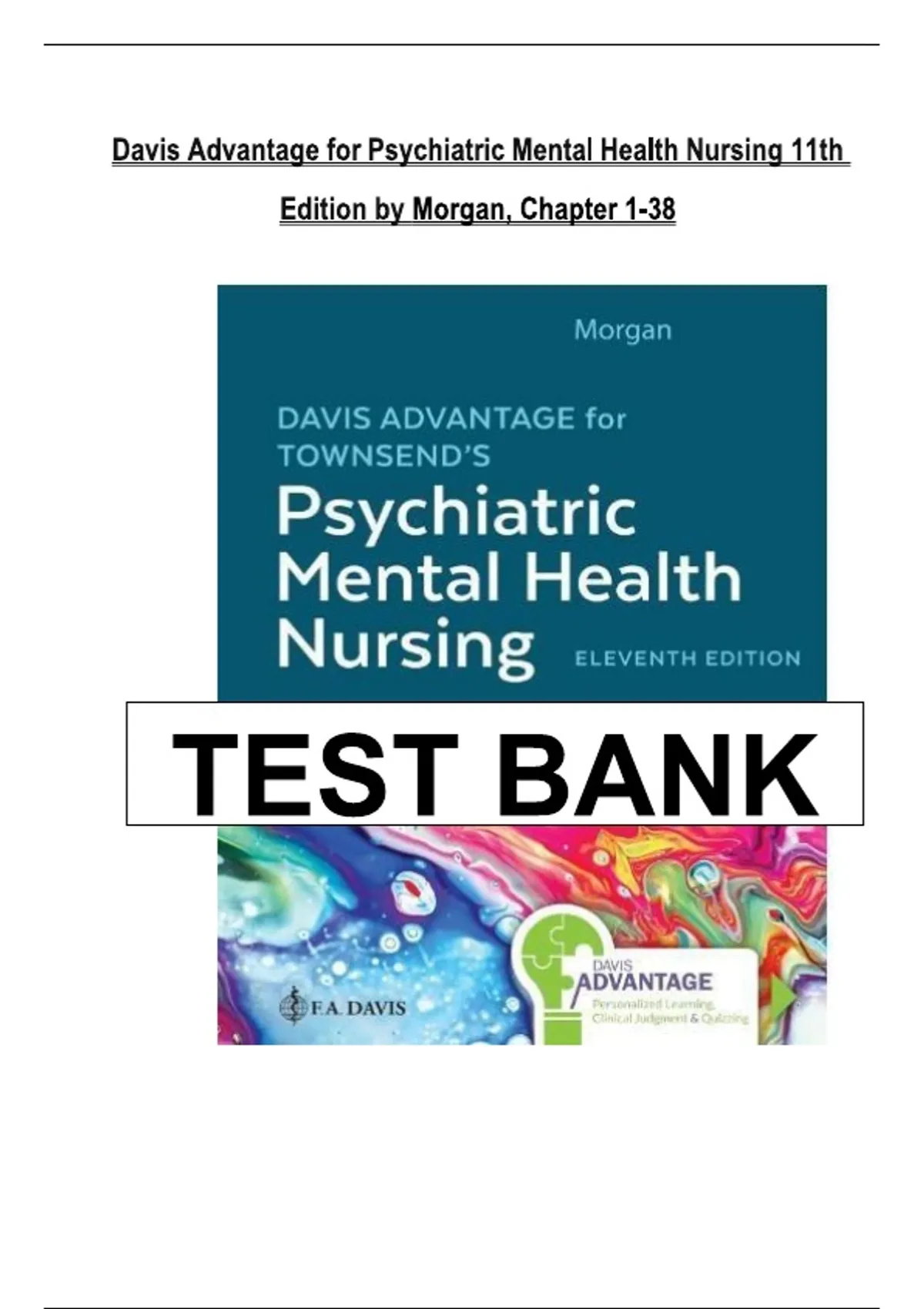 Test Bank for Davis Advantage for Townsend's Psychiatric Mental Health Nursing, 11th Edition by Karyn Morgan (Chapters 1-38)** is a comprehensive resource meticulously designed to support nursing students and educators in mastering the core principles of psychiatric and mental health nursing. Featuring hundreds of high-quality, exam-style questions and detailed rationales, this test bank encompasses all 38 chapters from the latest 11th edition. Each question is aligned with current clinical guidelines and evidence-based practices, ensuring relevance and accuracy for exam preparation or classroom assessment. Enhance your understanding of complex mental health concepts, therapeutic interventions, psychopharmacology, and ethical considerations. This indispensable tool enables students to reinforce their learning, achieve academic success, and confidently prepare for NCLEX or course examinations. --- Test Bank, Davis Advantage, Townsend's Psychiatric Mental Health Nursing, 11th Edition, Karyn Morgan, Answer Key, Exam Questions, NCLEX Prep, Chapter 1-38, Nursing Test Bank, Psychiatric Nursing Test Bank, Mental Health Nursing Test Bank, Davis Advantage Test Bank, Morgan Test Bank, Townsend Test Bank, Download Test Bank, Psychiatric Nursing Questions #TestBank #DavisAdvantage #TownsendPsychiatricNursing #Morgan11thEdition #PsychiatricNursing #MentalHealthNursing #NursingTestBank #NCLEXPrep #NursingStudents #Chapter1to38 #NursingEducation