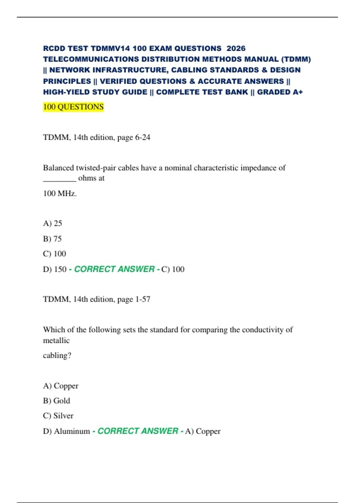 RCDD TEST TDMMV14 100 EXAM QUESTIONS 2026 TELECOMMUNICATIONS DISTRIBUTION METHODS MANUAL (TDMM) || NETWORK INFRASTRUCTURE, CABLING STANDARDS & DESIGN PRINCIPLES || VERIFIED QUESTIONS & ACCURATE ANSWERS || HIGH-YIELD STUDY GUIDE || COMPLETE TEST BANK || GRADED A+ 100 QUESTIONS TDMM, 14th edition, page 6-24 Balanced twisted-pair cables have a nominal characteristic impedance of ________ ohms at 100 MHz. A) 25 B) 75 C) 100 D) 150 - CORRECT ANSWER - C) 100 TDMM, 14th edition, page 1-57