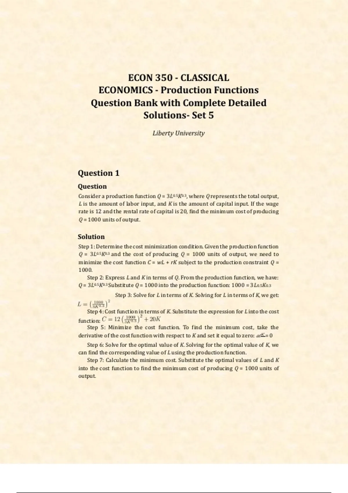 Step 4: Cost function in terms of K. Substitute the expression for L into the cost