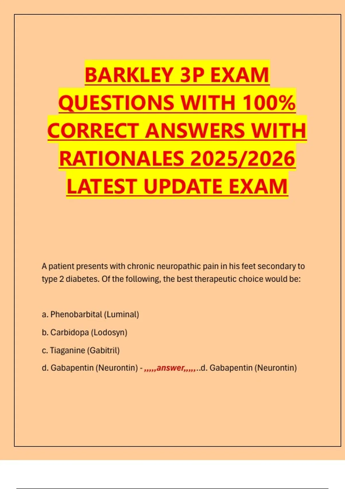 BARKLEY 3P EXAM QUESTIONS WITH 100% CORRECT ANSWERS WITH RATIONALES 2025/2026 LATEST UPDATE EXAM A patient presents with chronic neuropathic pain in his feet secondary to type 2 diabetes. Of the following, the best therapeutic choice would be