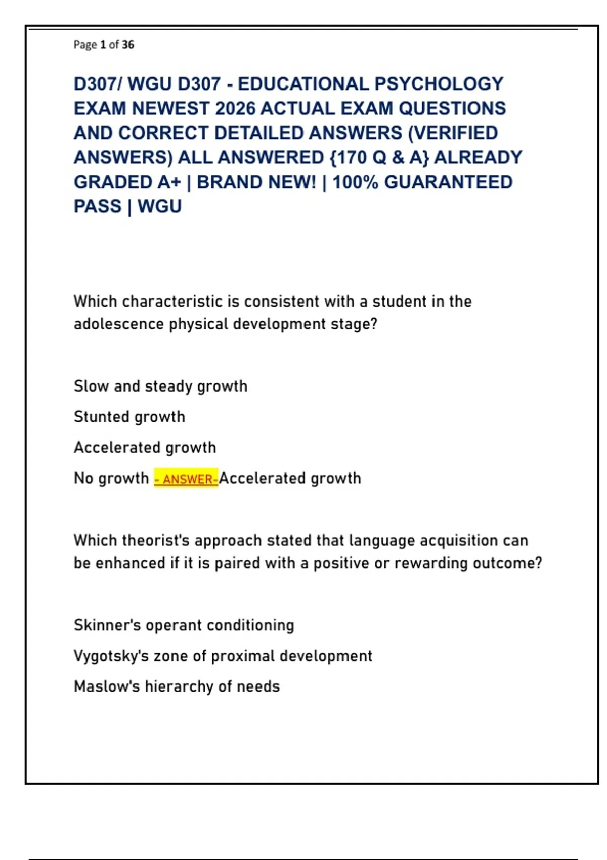 D307/ WGU D307 - EDUCATIONAL PSYCHOLOGY EXAM NEWEST 2026 ACTUAL EXAM QUESTIONS AND CORRECT DETAILED ANSWERS (VERIFIED ANSWERS) ALL ANSWERED {170 Q & A} ALREADY GRADED A+ | BRAND NEW! | 100% GUARANTEED PASS | WGU