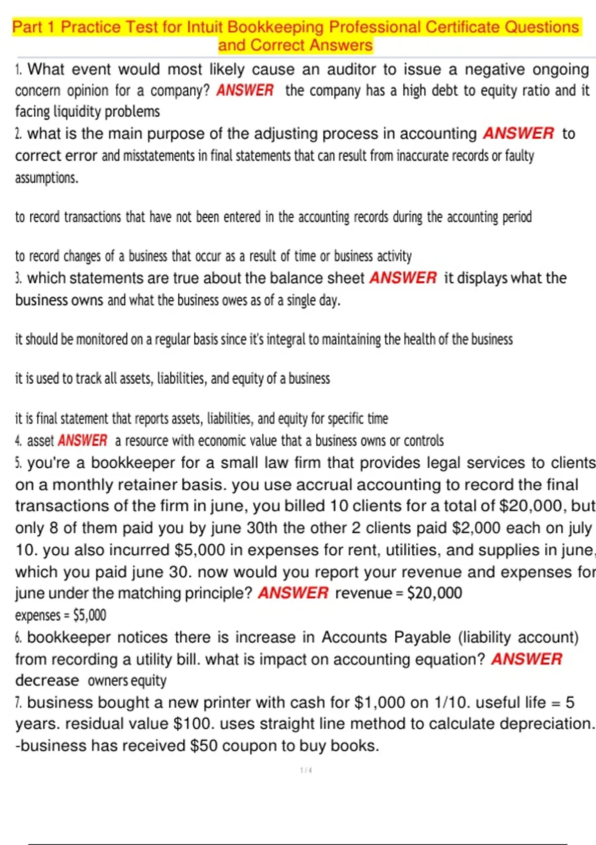 Part 1 Practice Test for Intuit Bookkeeping Professional Certificate Questions