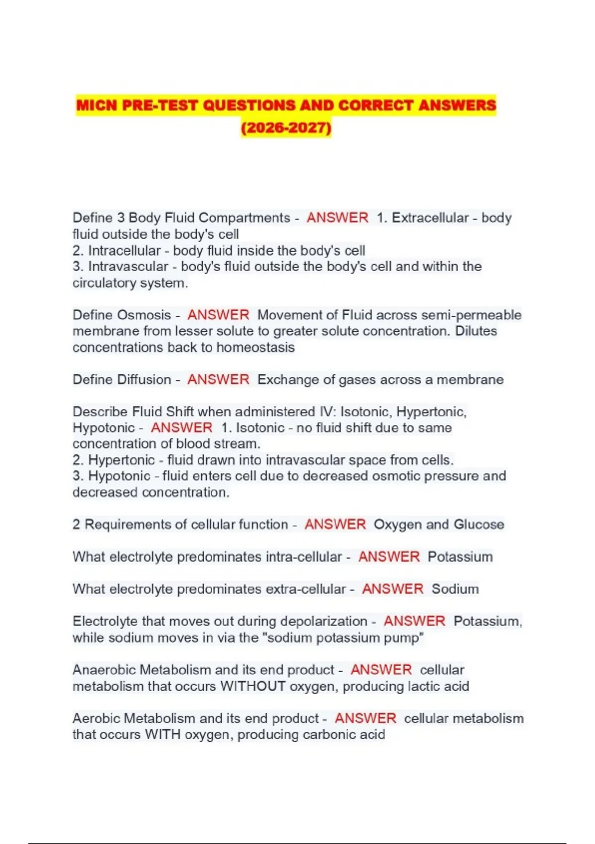 MICN PRE-TEST QUESTIONS AND CORRECT ANSWERS ()