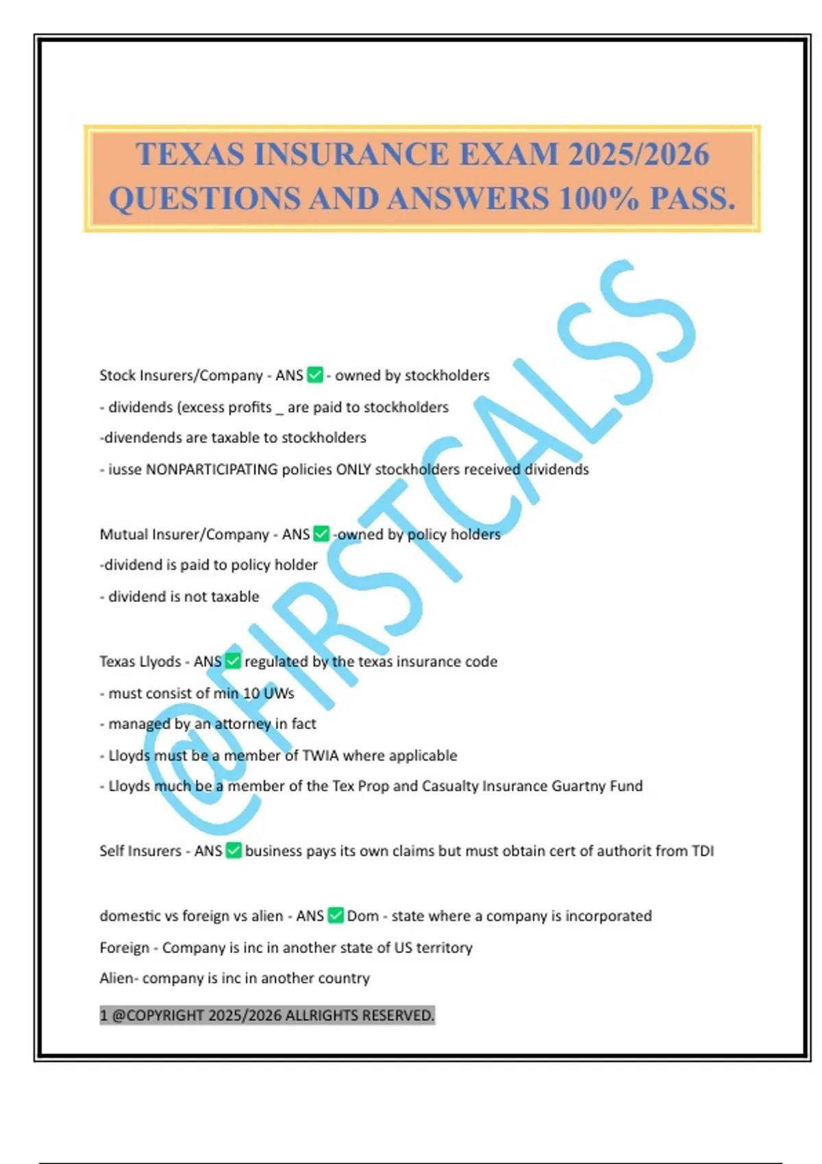 TEXAS INSURANCE EXAM 2025/2026 QUESTIONS AND ANSWERS 100% PASS.