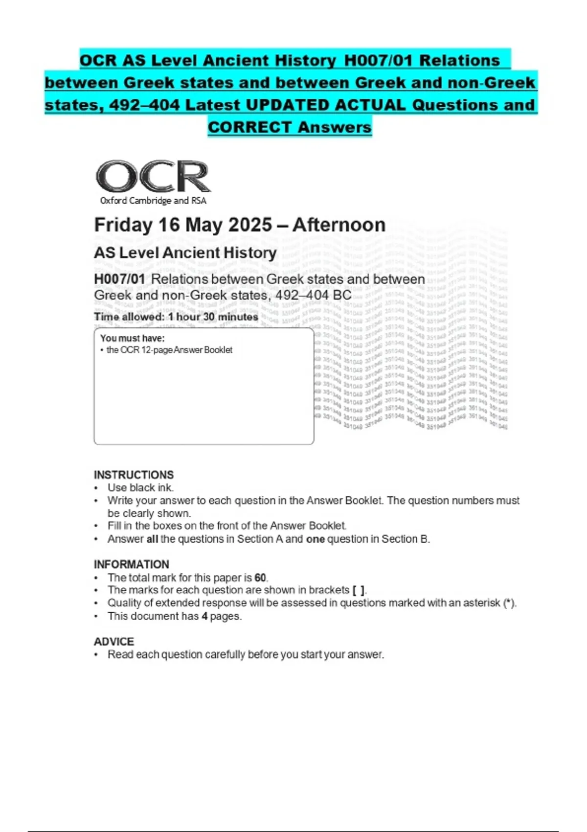OCR AS Level Ancient History H007/01 Relations between Greek states and between Greek and non‑Greek states, 492–404 Latest UPDATED ACTUAL Questions and CORRECT Answers
