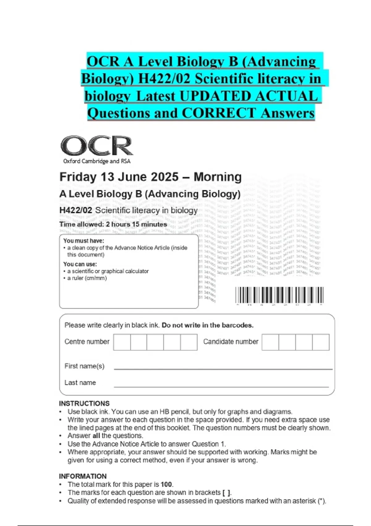 OCR A Level Biology B (Advancing Biology) H422/02 Scientific literacy in biology Latest UPDATED ACTUAL Questions and CORRECT Answers