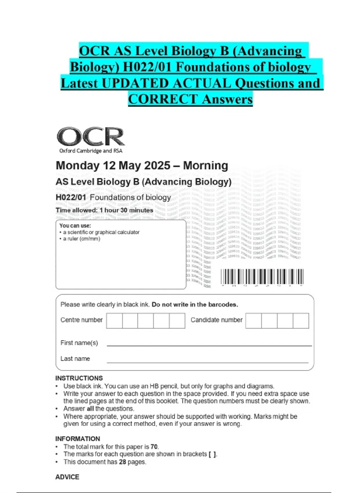 OCR AS Level Biology B (Advancing Biology) H022/01 Foundations of biology Latest UPDATED ACTUAL Questions and CORRECT Answers