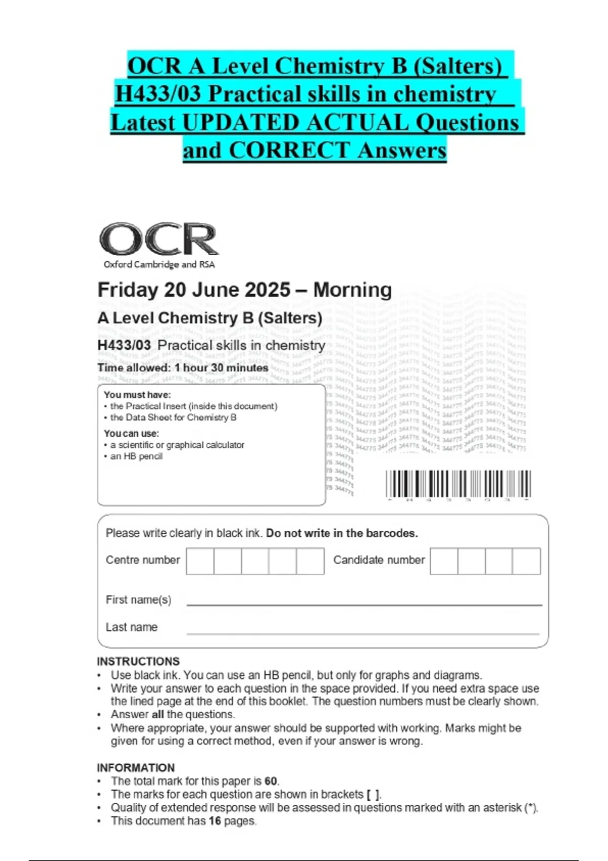 OCR A Level Chemistry B (Salters) H433/03 Practical skills in chemistry Latest UPDATED ACTUAL Questions and CORRECT Answers