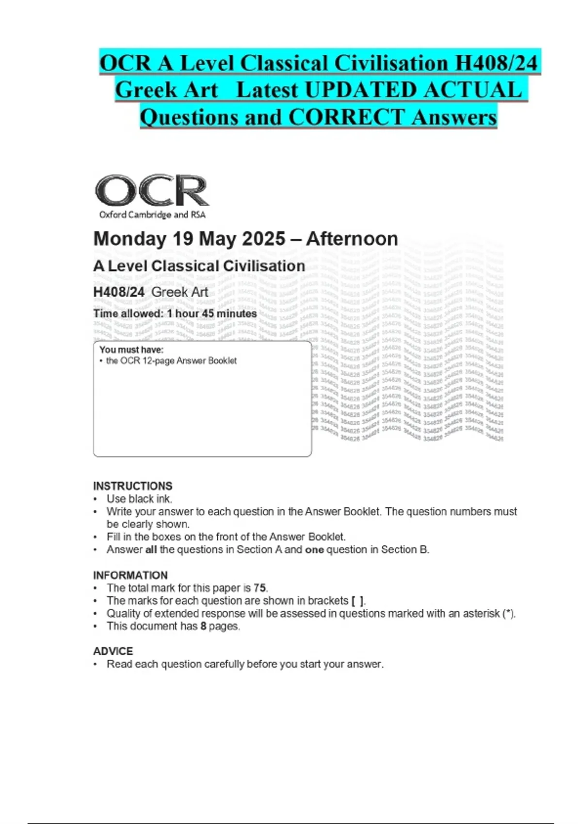 OCR A Level Classical Civilisation H408/24 Greek Art Latest UPDATED ACTUAL Questions and CORRECT Answers