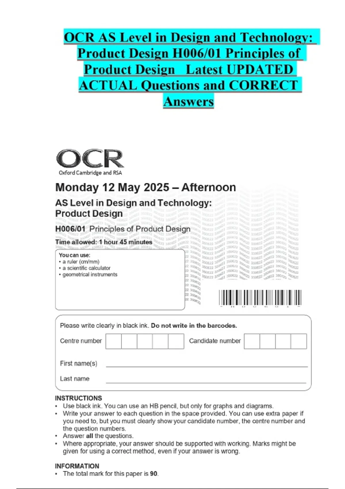 OCR AS Level in Design and Technology: Product Design H006/01 Principles of Product Design Latest UPDATED ACTUAL Questions and CORRECT Answers