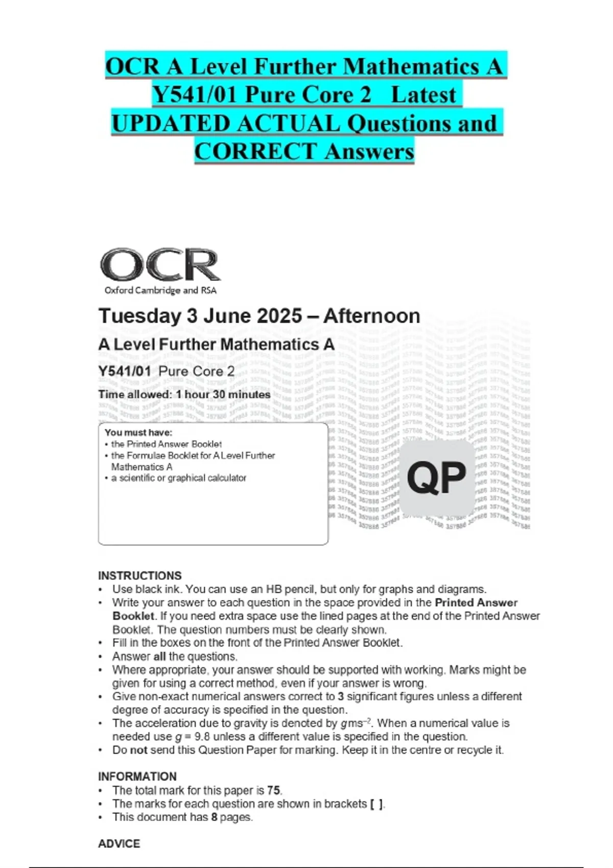 OCR A Level Further Mathematics A Y541/01 Pure Core 2 Latest UPDATED ACTUAL Questions and CORRECT Answers