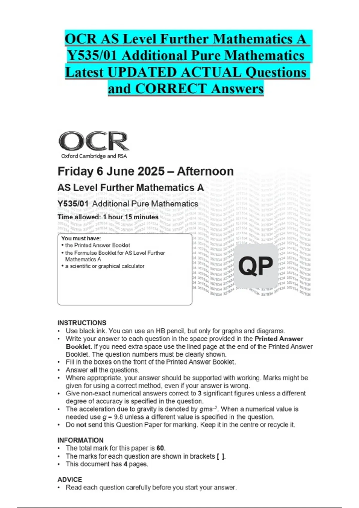 OCR AS Level Further Mathematics A Y535/01 Additional Pure Mathematics Latest UPDATED ACTUAL Questions and CORRECT Answers