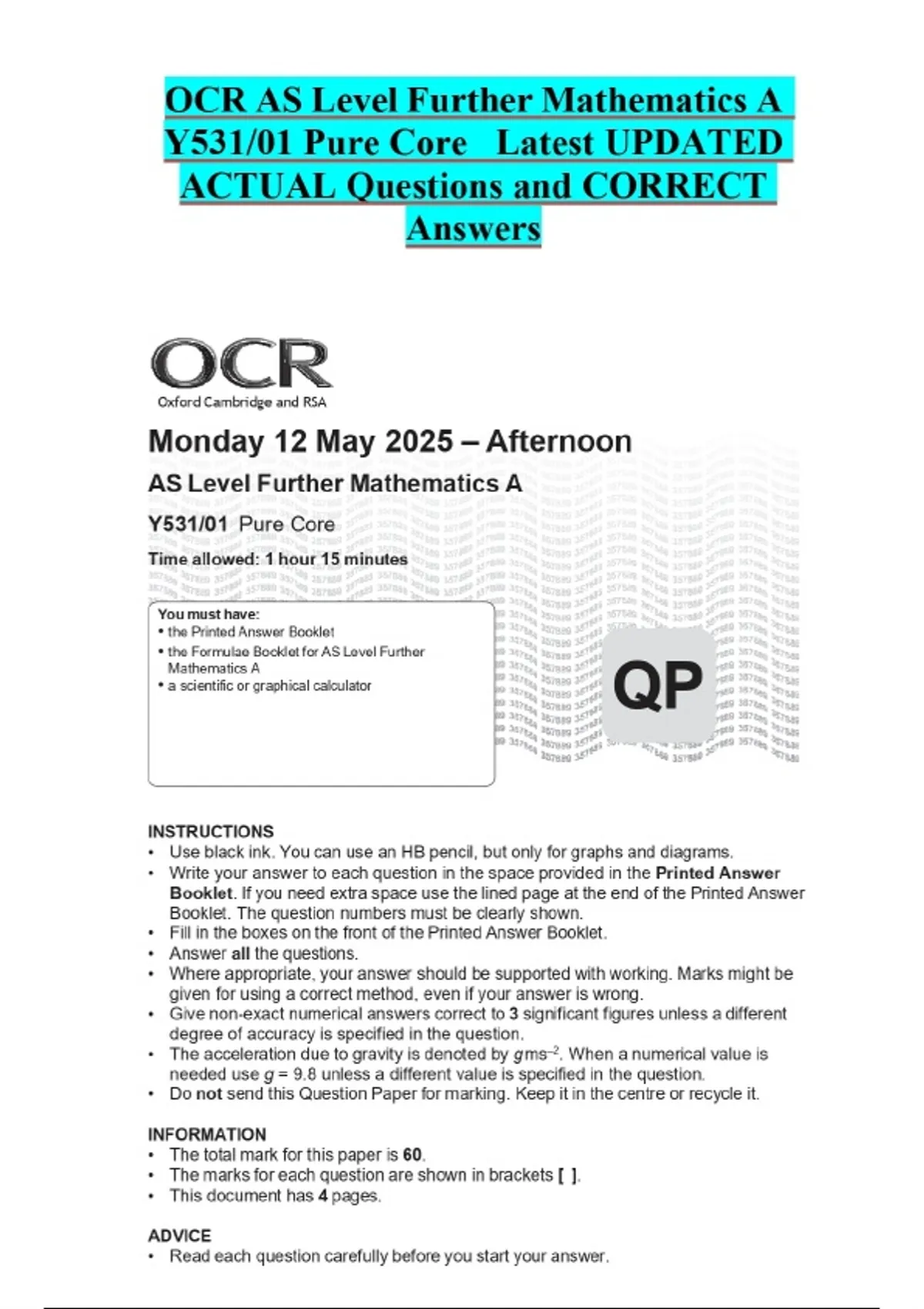 OCR AS Level Further Mathematics A Y531/01 Pure Core Latest UPDATED ACTUAL Questions and CORRECT Answers