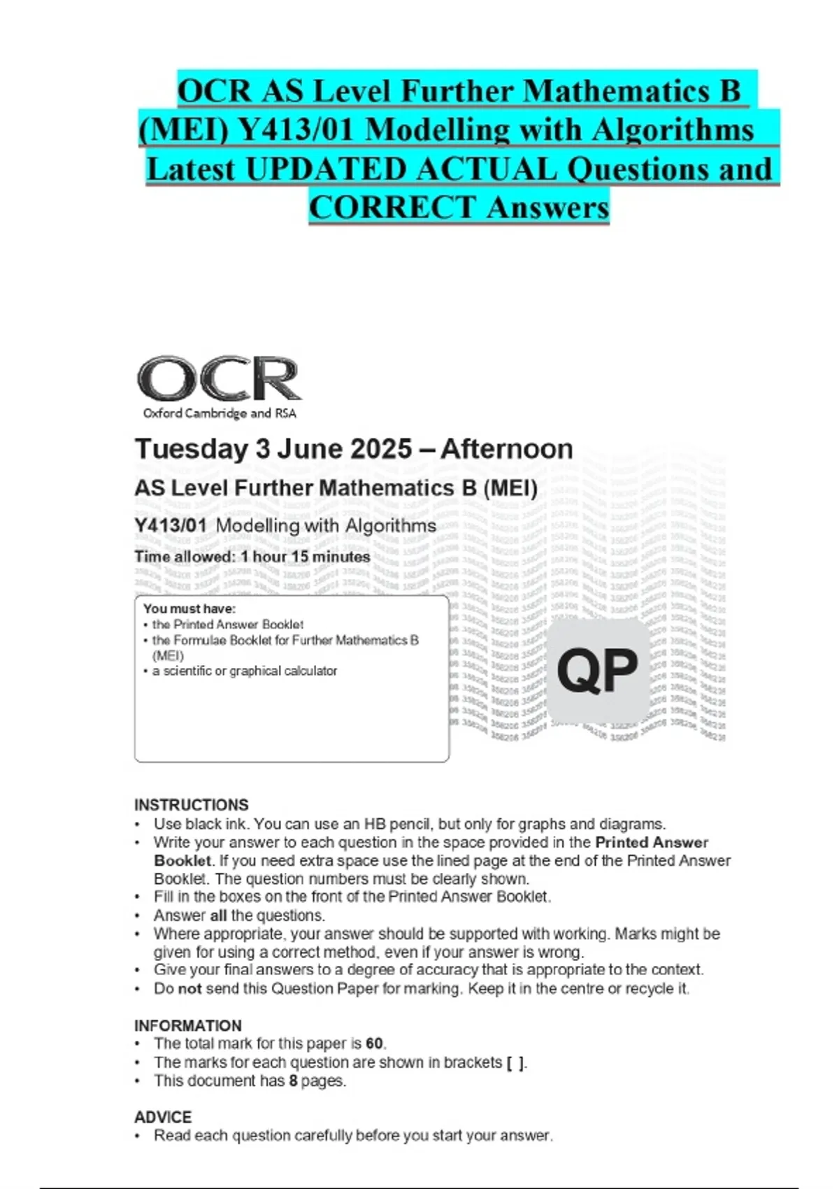 OCR AS Level Further Mathematics B (MEI) Y413/01 Modelling with Algorithms Latest UPDATED ACTUAL Questions and CORRECT Answers