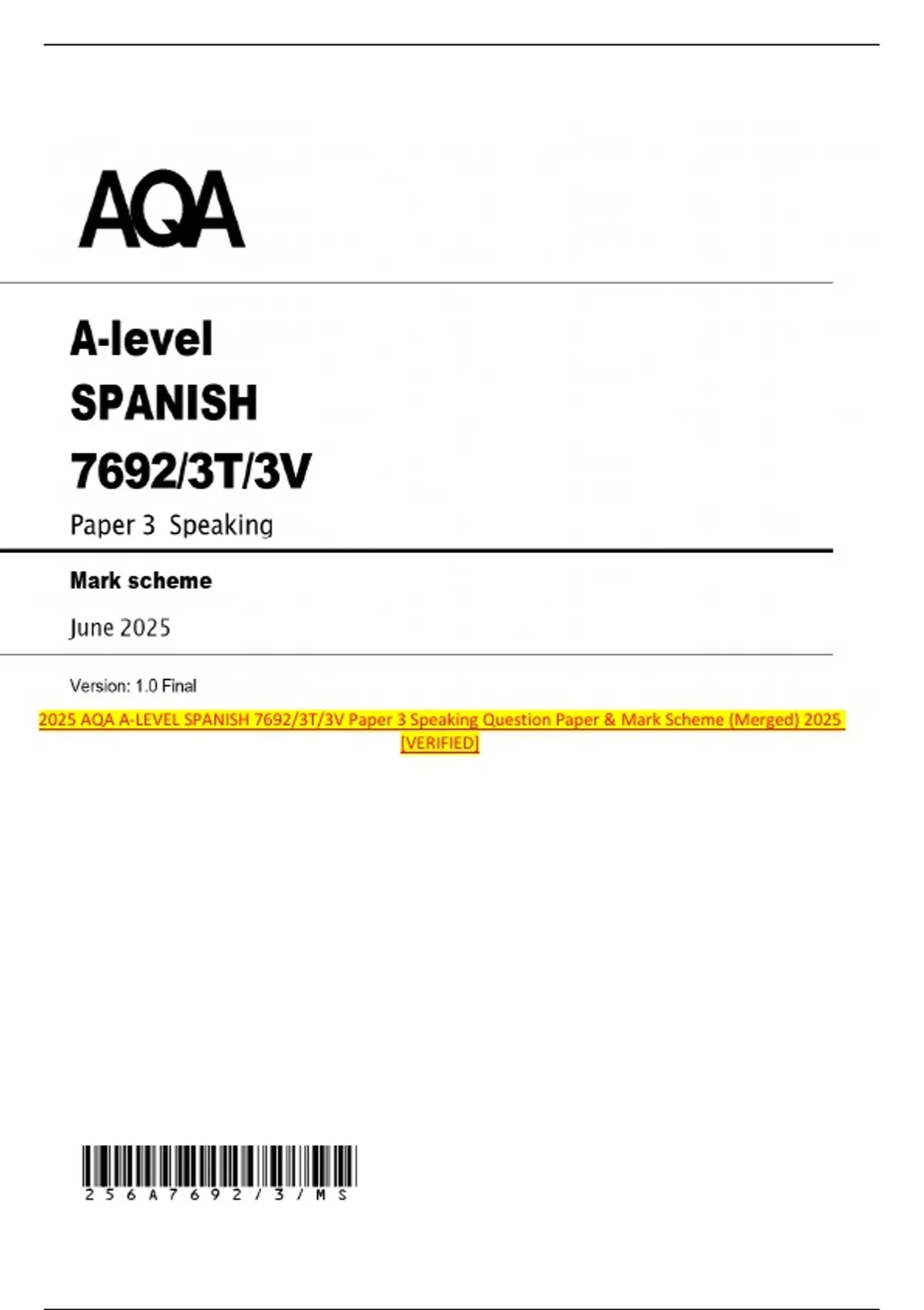 2025 AQA A-LEVEL SPANISH 7692/3T/3V Paper 3 Speaking Question Paper & Mark Scheme (Merged) 2025 [VERIFIED] MARK SCHEME – A-LEVEL SPANISH – 7692/3T/3V – JUNE 2025 Mark schemes are prepared by the Lead Assessment Writer and considered, together with the relevant questions, by a panel of subject teachers. This mark scheme includes any amendments made at the standardisation events which all associates participate in and is the scheme which was used by them in this examination. The standardisation process ensures that the mark scheme covers the students’ responses to questions and that every associate understands and applies it in the same correct way. As preparation for standardisation each associate analyses a number of students’ scripts. Alternative answers not already covered by the mark scheme are discussed and legislated for. If, after the standardisation process, associates encounter unusual answers which have not been raised they are required to refer these to the Lead Examiner. It must be stressed that a mark scheme is a working