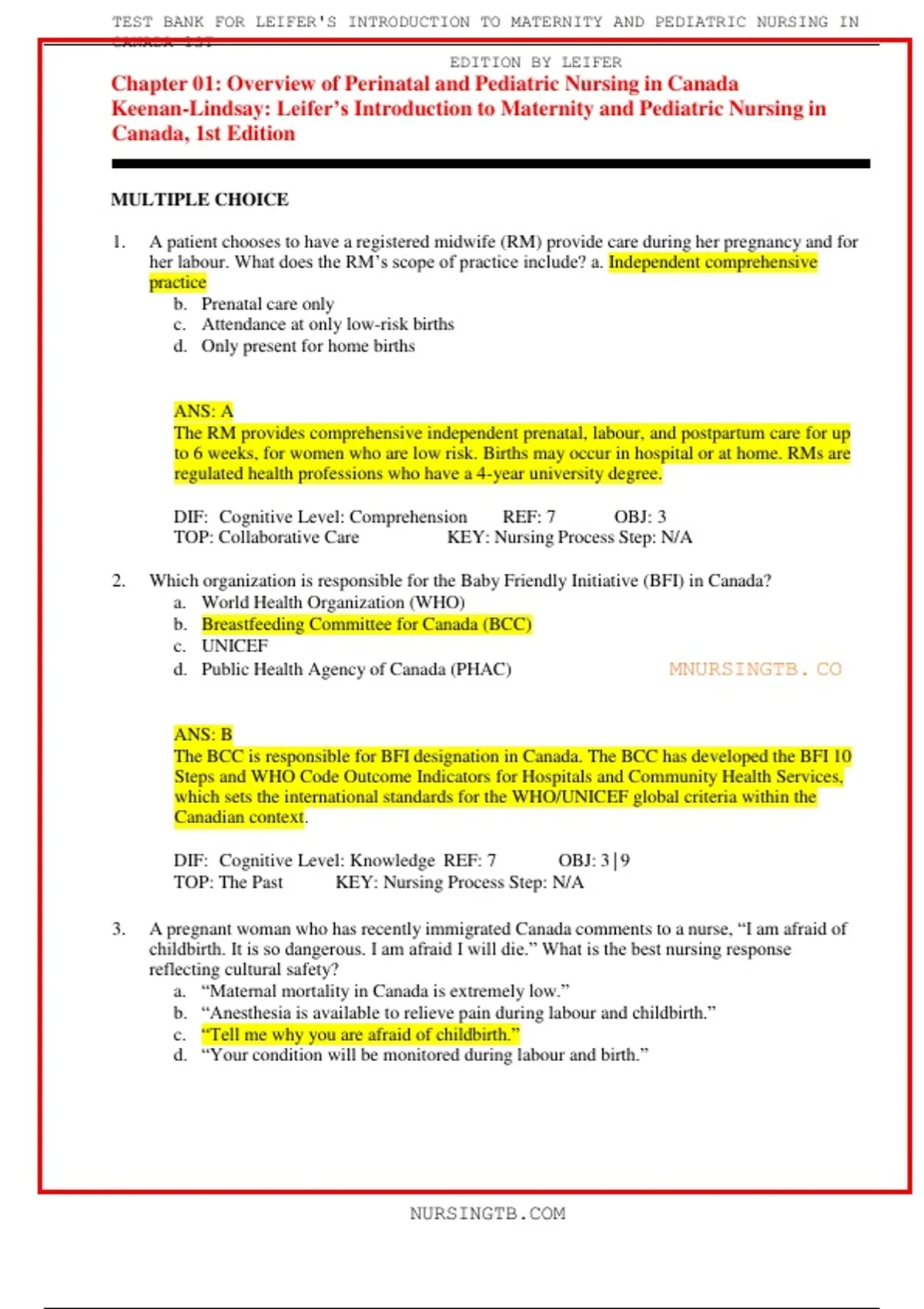 ,TEST BANK FOR LEIFER'S INTRODUCTION TO MATERNITY AND PEDIATRIC NURSING IN