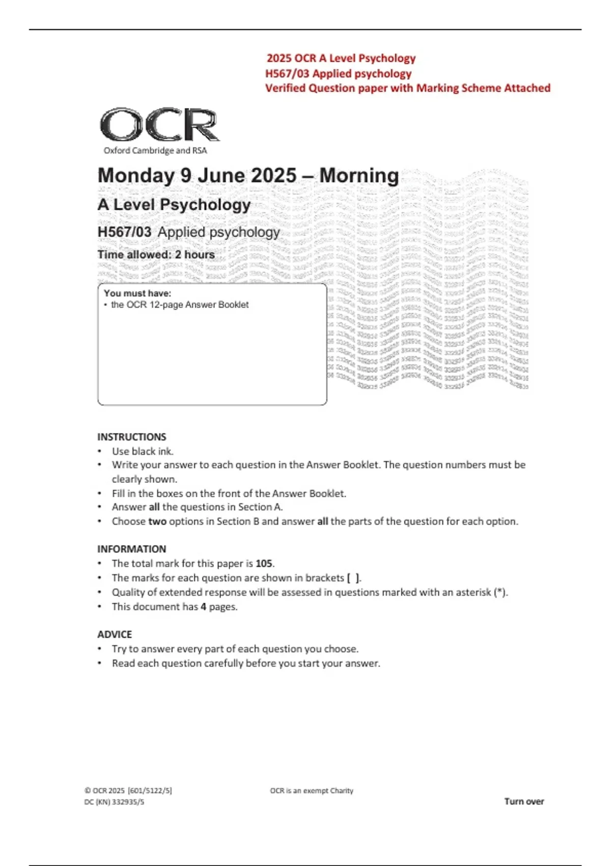 2025 OCR A Level Psychology H567/03 Applied Psychology Verified Question Paper with Full Mark Scheme PDF