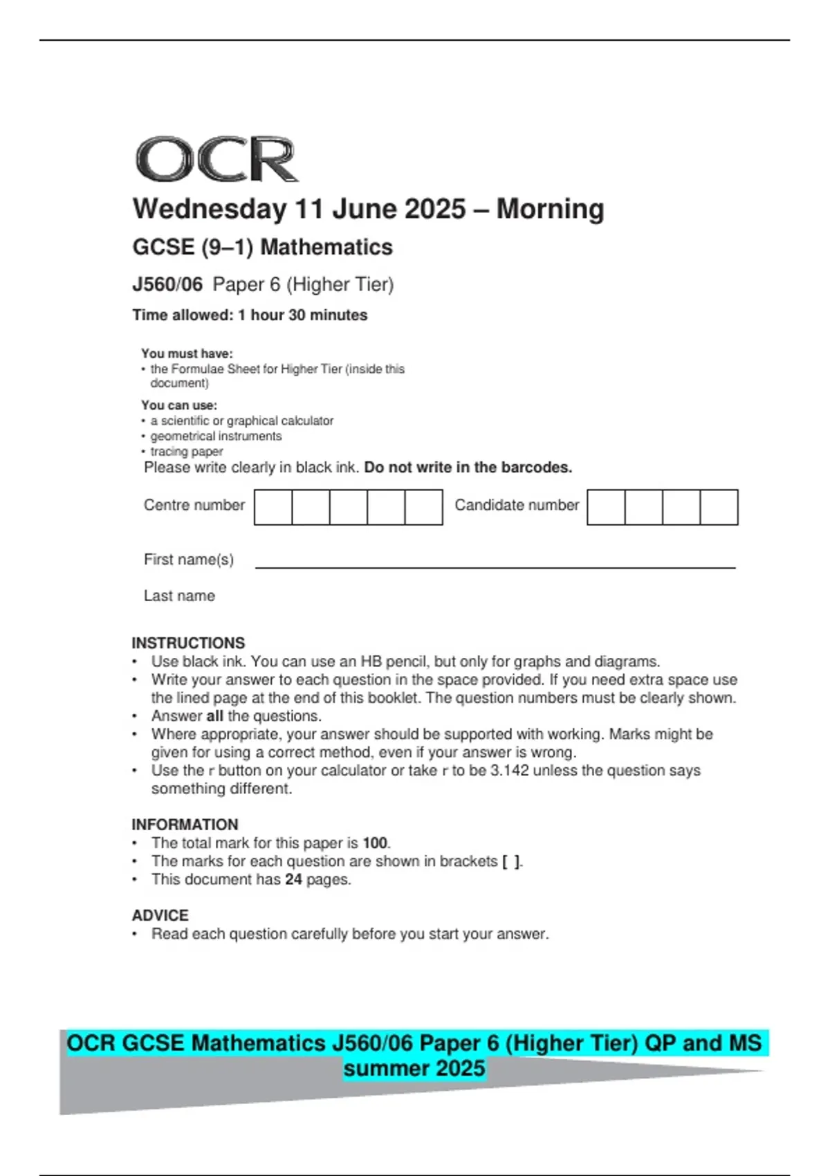 OCR GCSE Mathematics J560/06 Paper 6 (Higher Tier) QP and MS summer 2025