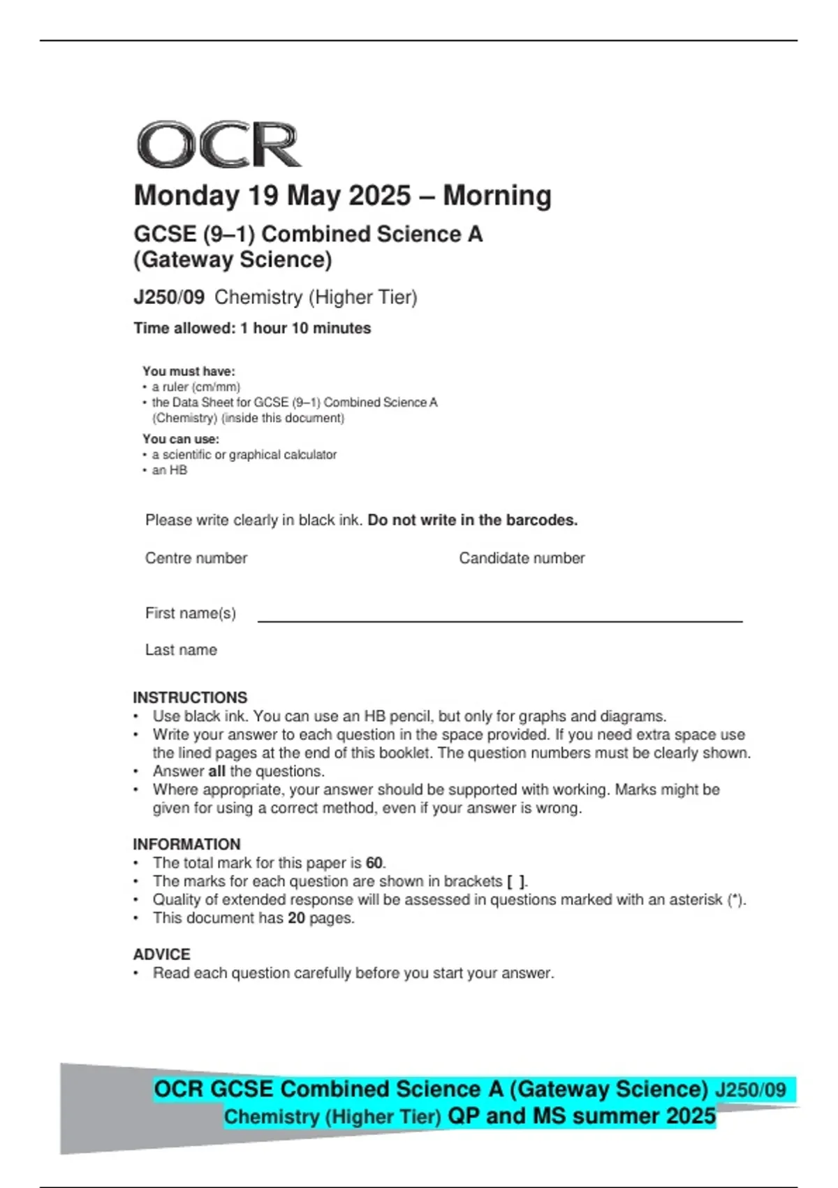 OCR GCSE Combined Science A (Gateway Science) J250/09 Chemistry (Higher Tier) QP and MS summer 2025