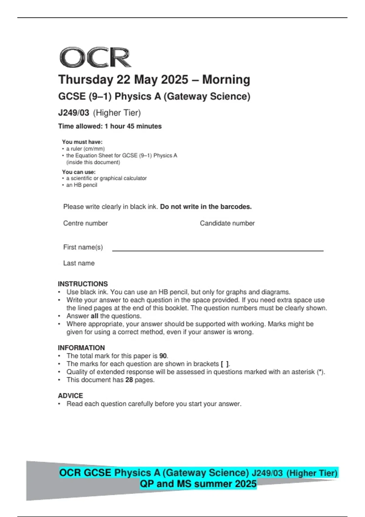 OCR GCSE Physics A (Gateway Science) J249/03 (Higher Tier)