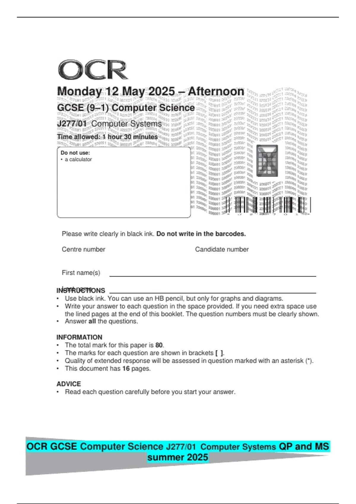 OCR GCSE Computer Science J277/01 Computer Systems QP and MS summer 2025