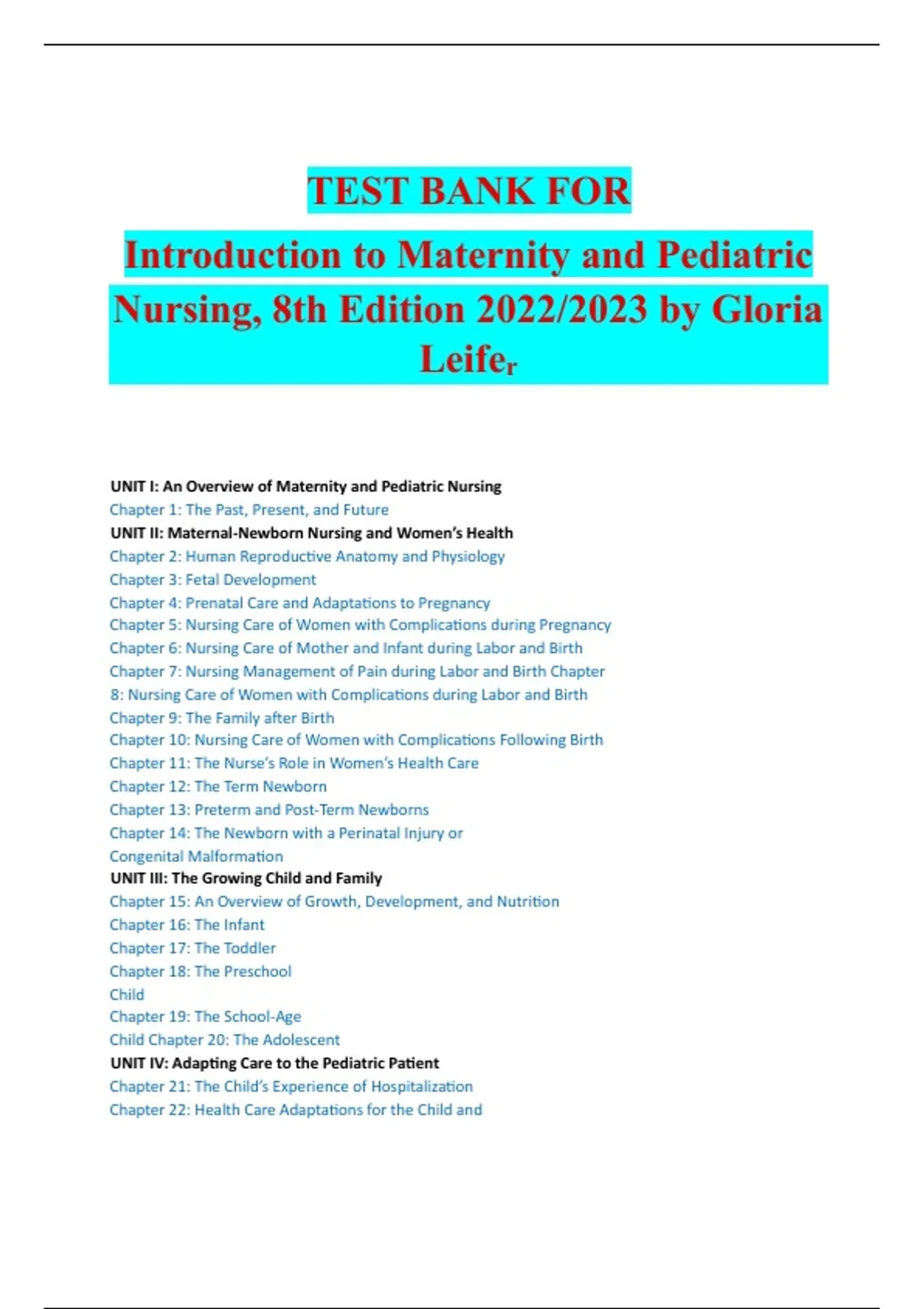 TEST BANK FOR Introduction to Maternity and Pediatric Nursing, 8th Edition 2022/2023 by Gloria Leifer With 100% Verified Questions & Correct Answers Graded A+ Guaranteed Pass