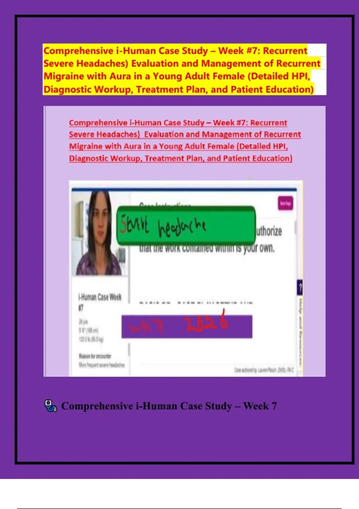 Comprehensive i-Human Case Study – Week #7: Recurrent Severe Headaches) Evaluation and Management of Recurrent Migraine with Aura in a Young Adult Female (Detailed HPI, Diagnostic Workup, Treatment Plan, and Patient Education)
