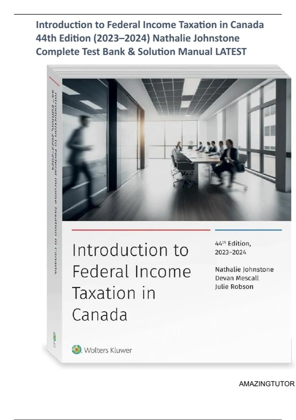 This document provides the full test bank and detailed solution manual for the 44th edition (2023–2024) of Introduction to Federal Income Taxation in Canada by Nathalie Johnstone. It includes hundreds of multiple-choice questions, problem-based scenarios, case law applications, and step-by-step solutions to exercises across all chapters. Topics covered include residency status, income determination, tax deductions and credits, corporate taxation, capital gains, employment benefits, and tax planning strategies, aligned with the Canadian Income Tax Act and current CRA guidelines.