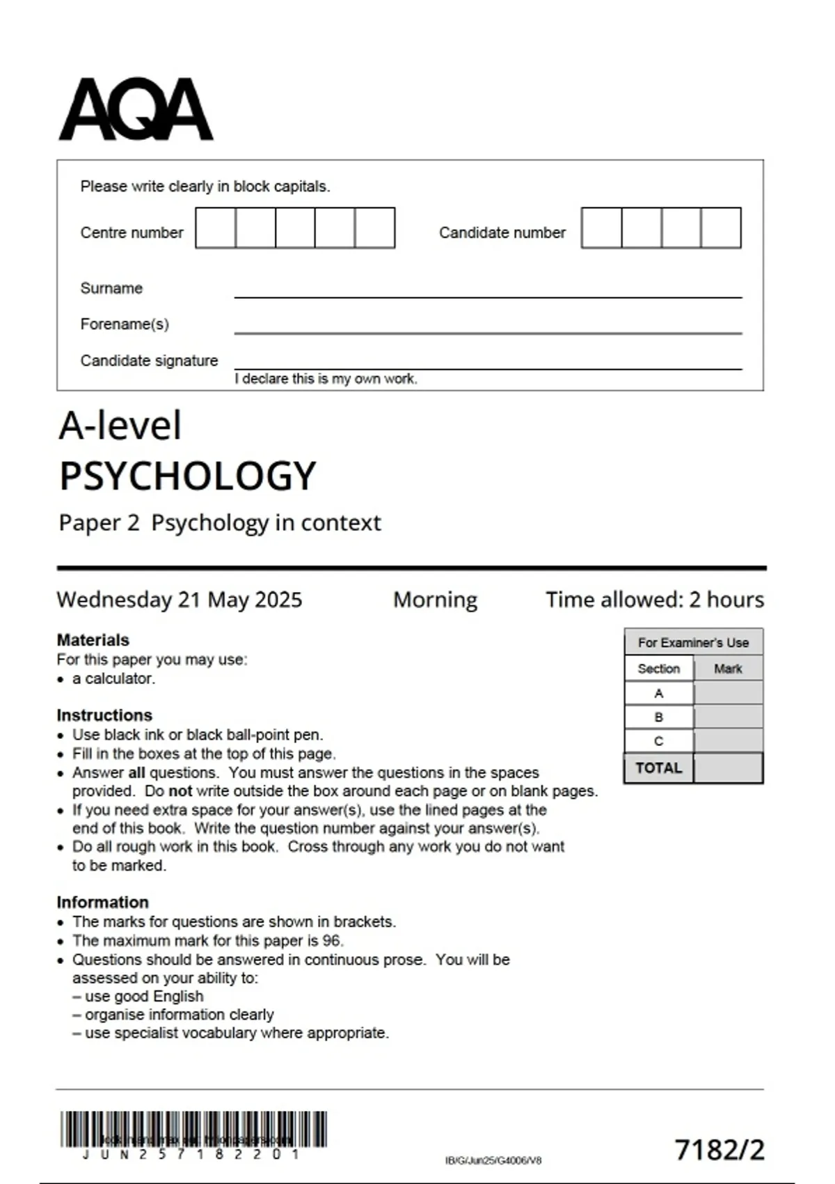 AQA A LEVEL MAY JUNE 2025 PSYCHOLOGY PAPER 2 QUESTION PAPER