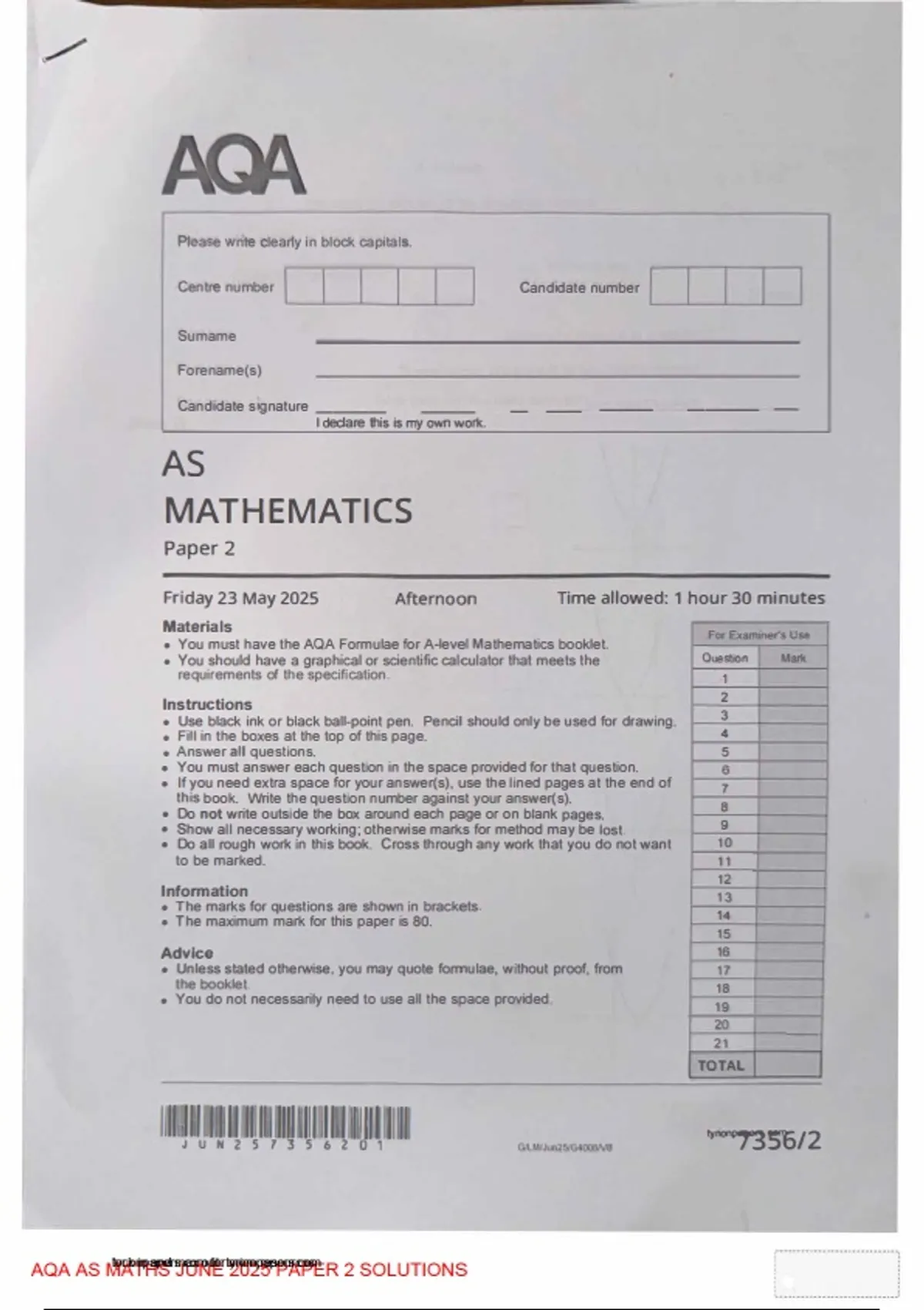 AQA AS MATHS JUNE 2025 PAPER 2 SOLUTIONS