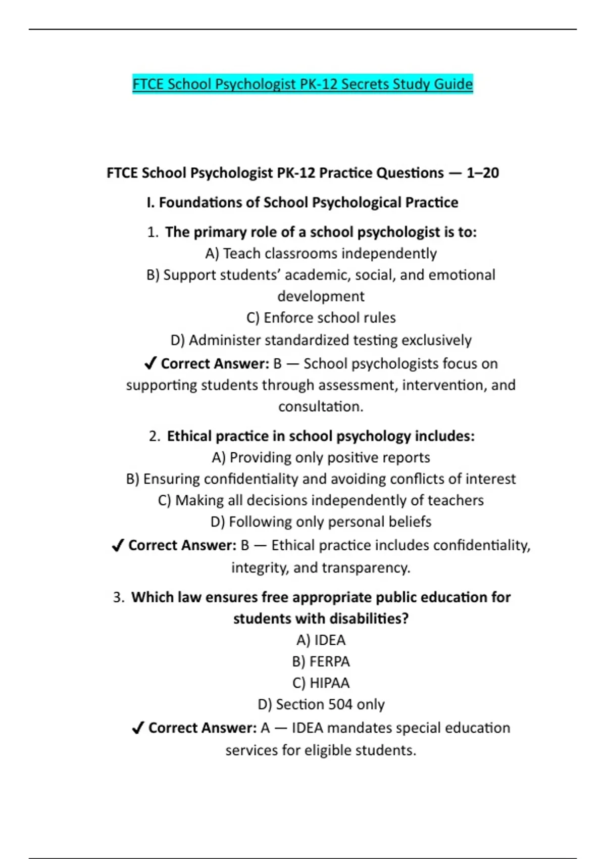 FTCE School Psychologist PK-12 Practice Questions — 1–20