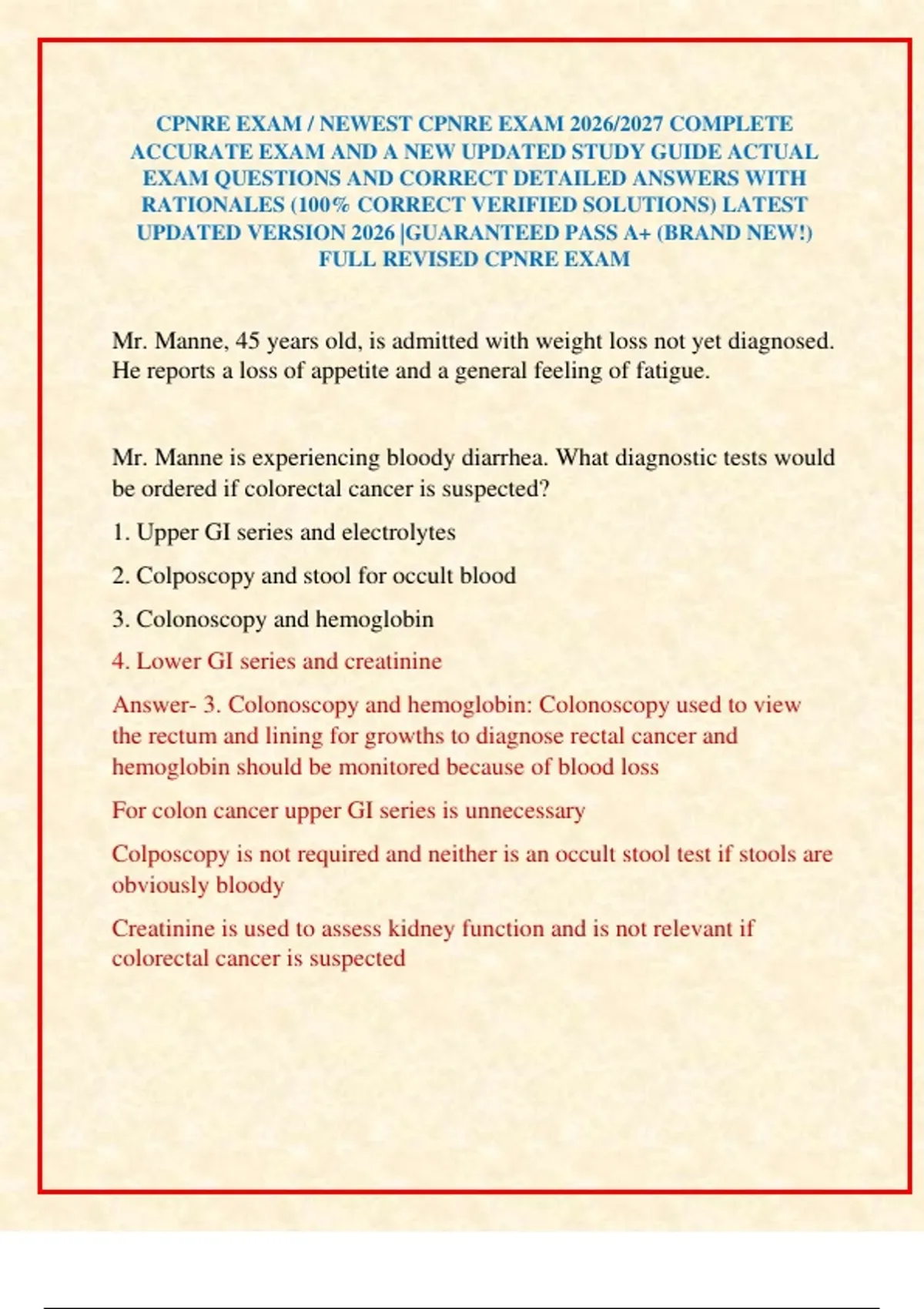 CPNRE EXAM / NEWEST CPNRE EXAM 2026/2027 COMPLETE ACCURATE EXAM AND A NEW UPDATED STUDY GUIDE ACTUAL EXAM QUESTIONS AND CORRECT DETAILED ANSWERS WITH RATIONALES (100% CORRECT VERIFIED SOLUTIONS) LATEST UPDATED VERSION 2026 |GUARANTEED PASS A+ (BRAND NEW!) FULL REVISED CPNRE EXAM