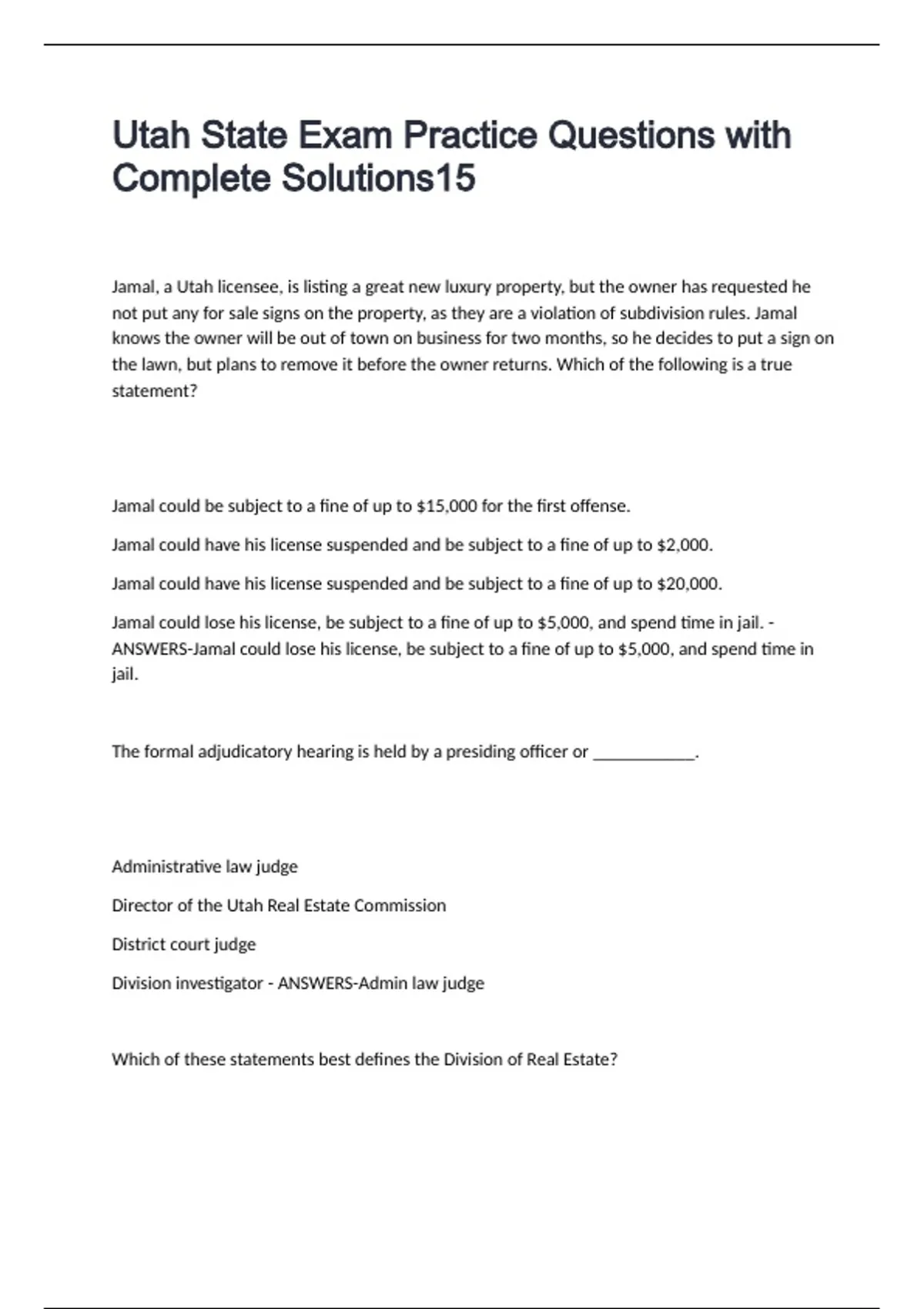 Utah State Exam Practice Questions with Complete Solutions Jamal, a Utah licensee, is listing a great new luxury property, but the owner has requested he not put any for sale signs on the property, as they are a violation of subdivision rules. Jamal knows the owner will be out of town on business for two months, so he decides to put a sign on the lawn, but plans to remove it before the owner returns. Which of the following is a true statement? Jamal could be subject to a fine of up to $15,000 for the first offense. Jamal could have his license suspended and be subject to a fine of up to $2,000. Jamal could have his license suspended and be subject to a fine of up to $20,000. Jamal could lose his license, be subject to a fine of up to $5,000, and spend time in jail. - ANSWERS-Jamal could lose his license, be subject to a fine of up to $5,000, and spend time in jail. The formal adjudicatory hearing is held by a presiding officer or ___________. Administrative law judge Director of the Utah Real Estate Commission District court judge Division investigator - ANSWERS-Admin law judge Which of these statements best defines the Division of Real Estate?
