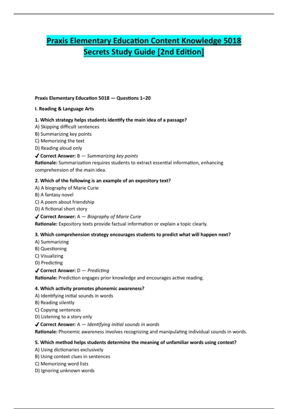 Praxis Elementary Education 5018 — Questions 1–20